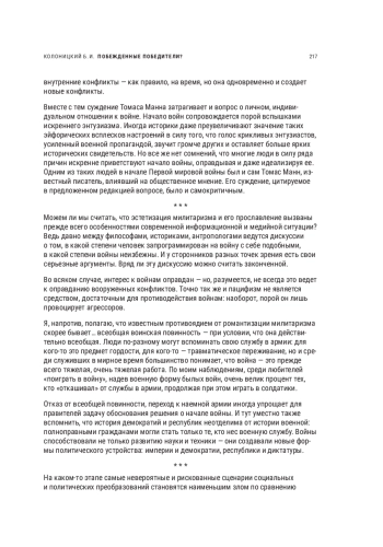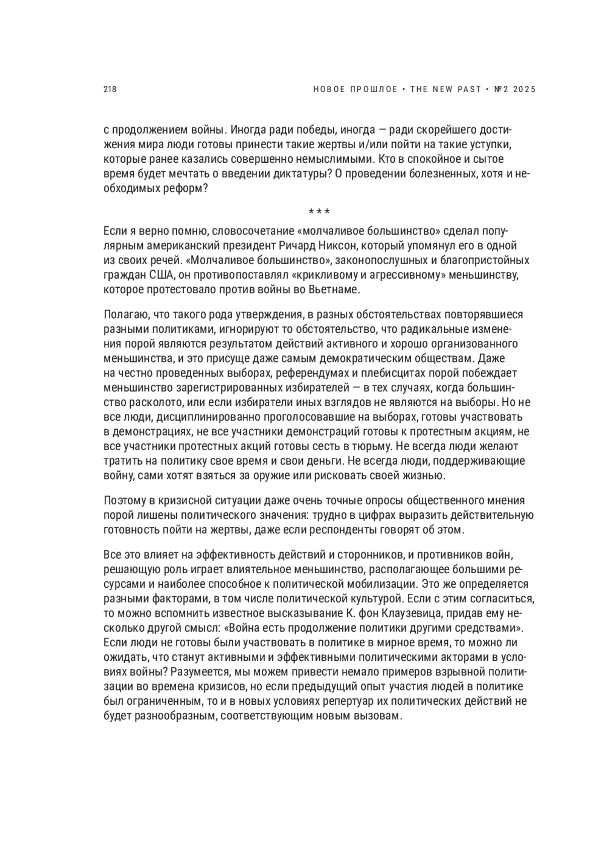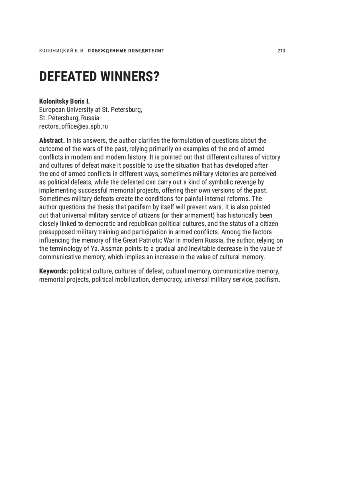 В своих ответах автор уточняет постановку вопросов относительно итогов войн прошлого, опираясь прежде всего на примеры завершения вооруженных конфликтов в Новой и новейшей истории. Указывается, что различные культуры победы и культуры поражения позволяют по-разному использовать ситуацию, сложившуюся после завершения вооруженных конфликтов. Иногда военные победы воспринимаются как политические поражения, побежденные же могут осуществлять своеобразный символический реванш, реализуя успешные мемориальные проекты, предлагая свои версии прошлого. Порой военные поражения создают условия для проведения болезненных внутренних реформ. Автор подвергает сомнению тезис о том, что пацифизм сам по себе позволит предотвратить войны. Указывается также, что всеобщая воинская повинность граждан (или их вооружение) исторически была тесно связана с демократическими и республиканскими политическими культурами, статус гражданина предполагал военную подготовку и участие в вооруженных конфликтах. Среди факторов, влияющих на память о Великой Отечественной войне в современной России, автор, опираясь на терминологию Я. Ассмана, указывает на постепенное и неизбежное снижение значения коммуникативной памяти, что предполагает усиление значения памяти культурной