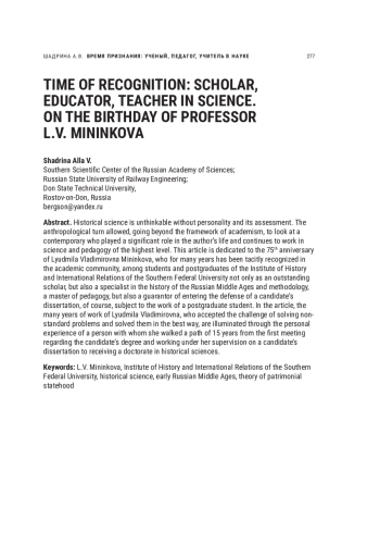 Историческая наука немыслима без личности и ее оценки. Антропологический поворот позволил, выйдя за рамки академизма, взглянуть на современника, сыгравшего значимую роль в жизни автора и продолжающего работать в науке и педагогике высшего звена. Настоящая статья посвящена 75-летнему юбилею Людмилы Владимировны Мининковой, которая на протяжении многих лет в научном сообществе, среди студентов и аспирантов Института истории и международных отношений Южного федерального университета негласно считается не только выдающимся ученым, специалистом по истории русского Средневековья и методологии, мастером педагогики, но и гарантом выхода на защиту кандидатской диссертации, разумеется, при условии работы аспиранта. В статье многолетние труды Людмилы Владимировны, принявшей вызов решения нестандартных задач и наилучшим образом их решившей, освещены через личностный опыт человека, прошедшего рядом с ней путь длиной в 15 лет от первой встречи по поводу соискательства и работы под ее руководством над кандидатской диссертацией до получения степени доктора исторических наук