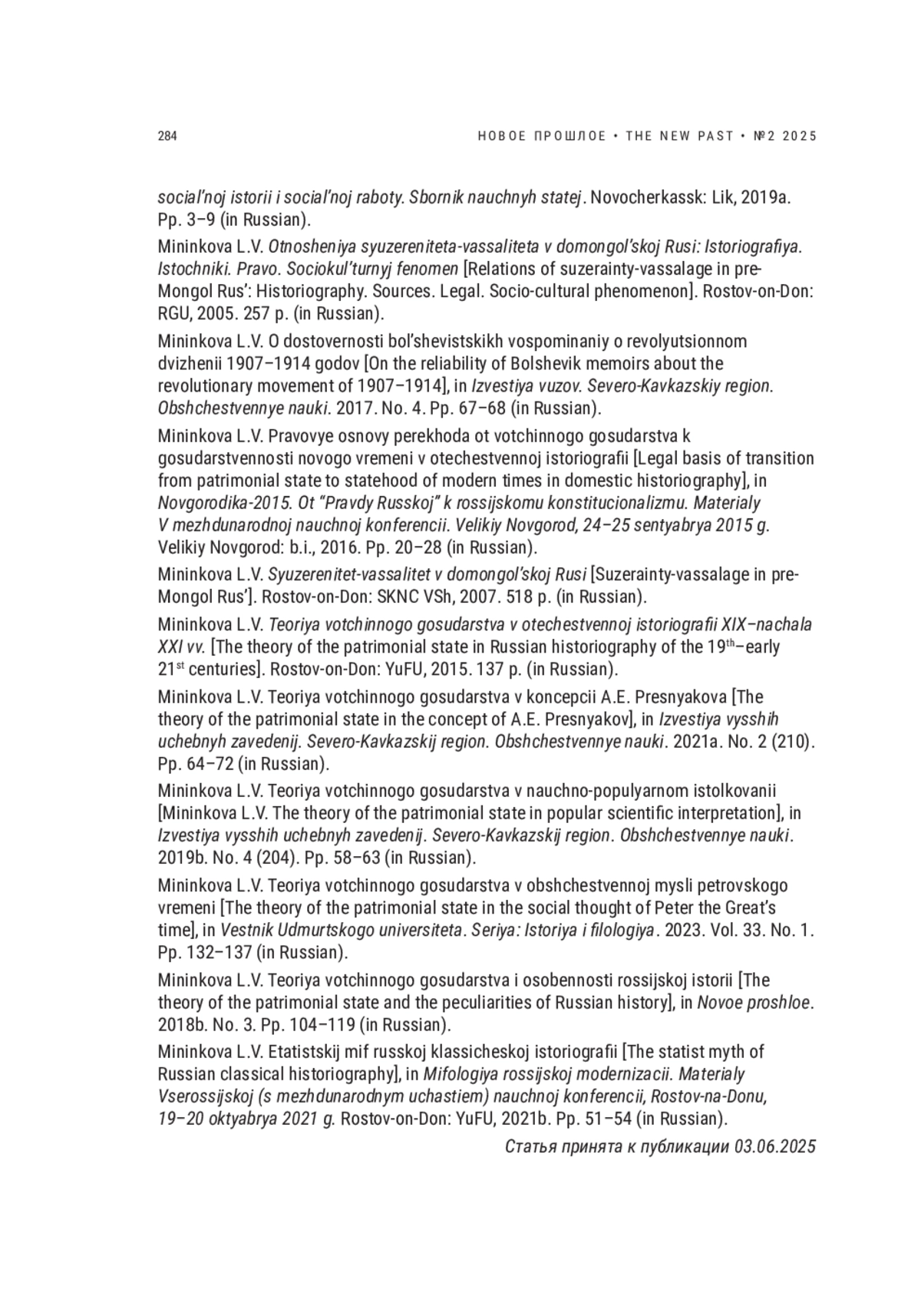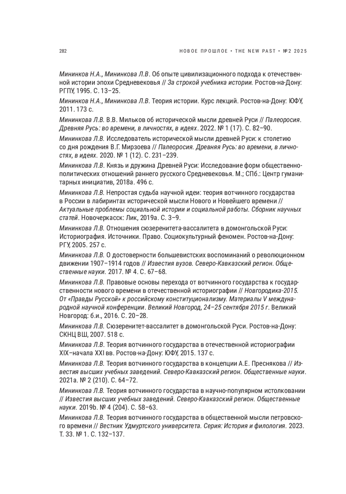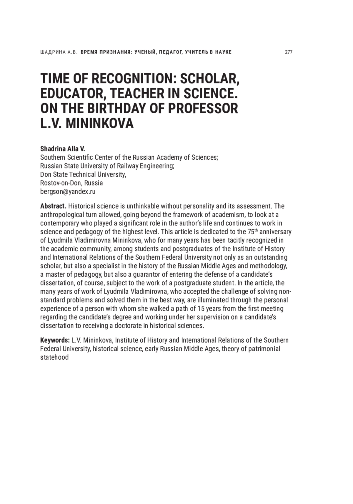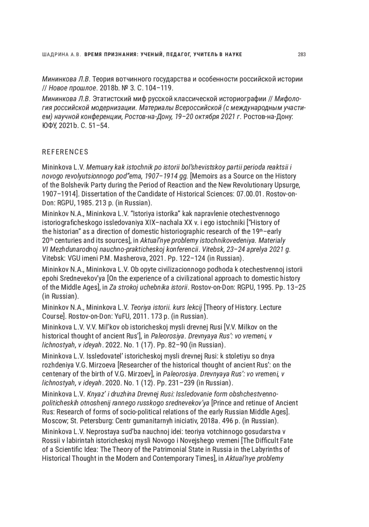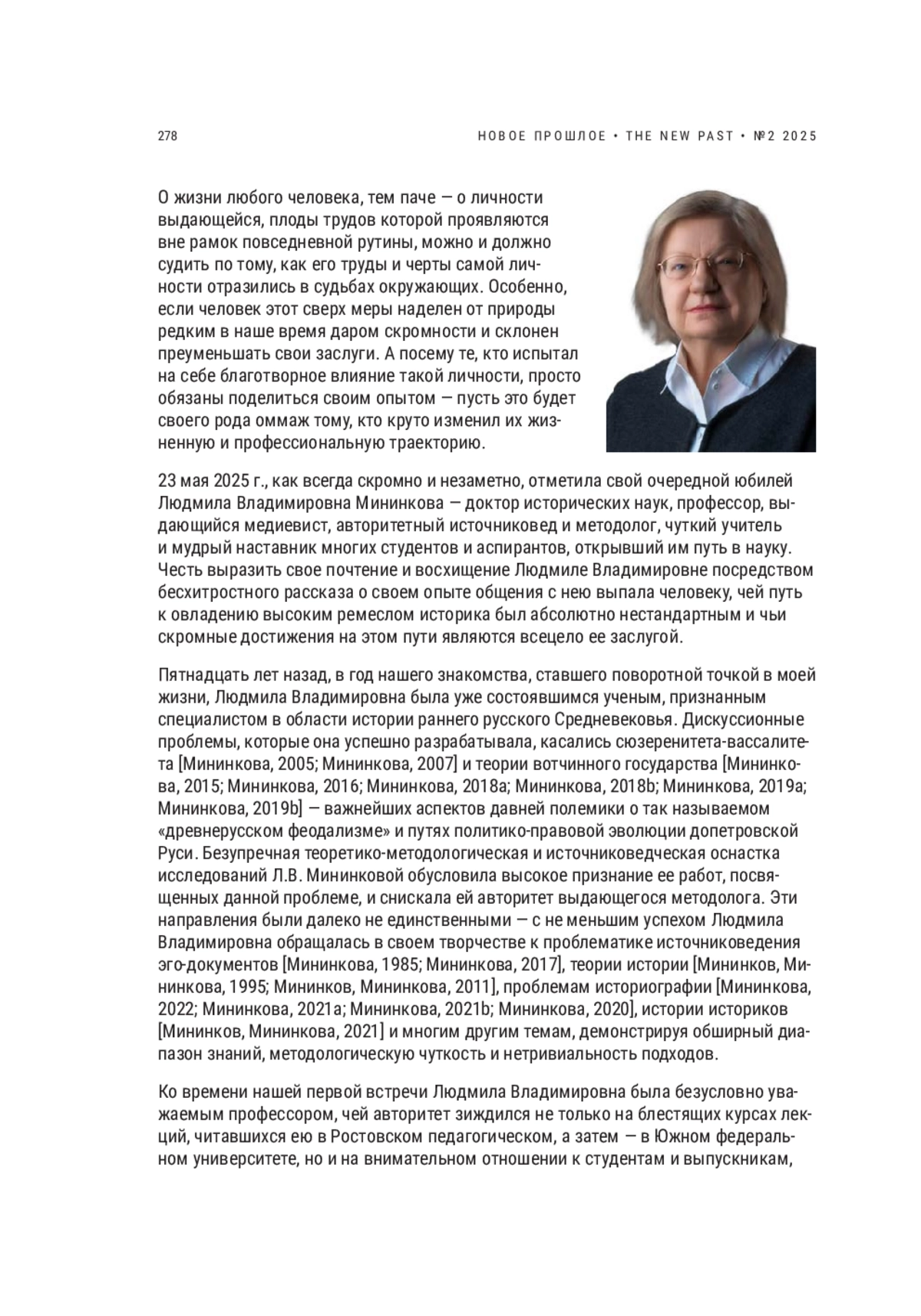 ШАДРИНА А. В. ВРЕМЯ ПРИЗНАНИЯ: УЧЕНЫЙ, ПЕДАГОГ, УЧИТЕЛЬ В НАУКЕ. КО ДНЮ РОЖДЕНИЯ ПРОФЕССОРА Л. В. МИНИНКОВОЙ // НОВОЕ ПРОШЛОЕ. 2025. № 2