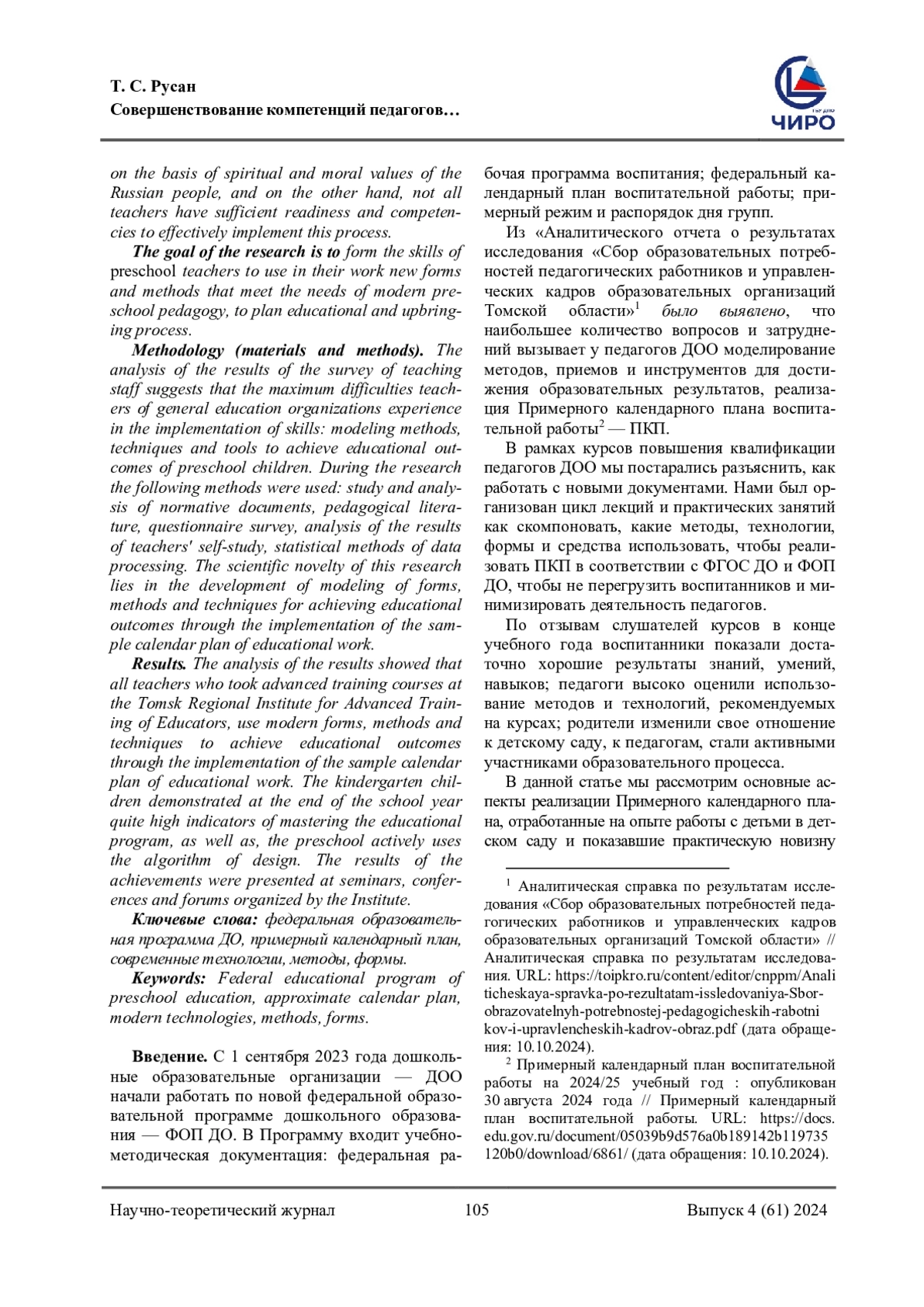 Проблема исследования и обоснование ее актуальности. Исследование показало, что значительное количество педагогических работников обладают недостаточным уровнем готовности к использованию новых форм, методов, технологий в своей практике и хотели бы приобрести профессиональные умения. Противоречие заключается в том, что, с одной стороны, существует необходимость формирования разностороннего развития ребенка дошкольного возраста на основе духовно-нравственных ценностей российского народа, а с другой, не все педагоги обладают достаточной готовностью и компетенциями для эффективного осуществления этого процесса. Цель исследования: формирование умений педагогов ДОО использовать в своей работе новые формы и методы, отвечающие потребностям современной дошкольной педагогики, планировать образовательный и воспитательный процесс. Методология (материалы и методы). Анализ результатов опроса педагогических работников говорит о том, что максимальные затруднения педагоги общеобразовательных организаций испытывают при реализации умений: моделирование методов, приемов и инструментов для достижения образовательных результатов детьми дошкольного возраста. В ходе исследования были использованы следующие методы: изучение и анализ нормативных документов, педагогической литературы, анкетирование, анализ результатов самообследования педагогов, статистические методы обработки данных. Научная новизна данного исследования заключается в разработке моделирования форм, методов и приемов для достижения образовательных результатов посредством реализации Примерного календарного плана воспитательной работы. Результаты. Анализ полученных результатов показал, что все педагоги, прошедшие обучение на курсах повышения квалификации в ТОИПКРО, используют современные формы, методы и приемы для достижения образовательных результатов посредством реализации Примерного календарного плана воспитательной работы. Воспитанники детских садов продемонстрировали на конец учебного года достаточно высокие показатели освоения программы воспитания, а также в ДОО активно используется алгоритм проектирования. Результаты достижений были представлены на семинарах, конференциях и форумах, организованных институтом.