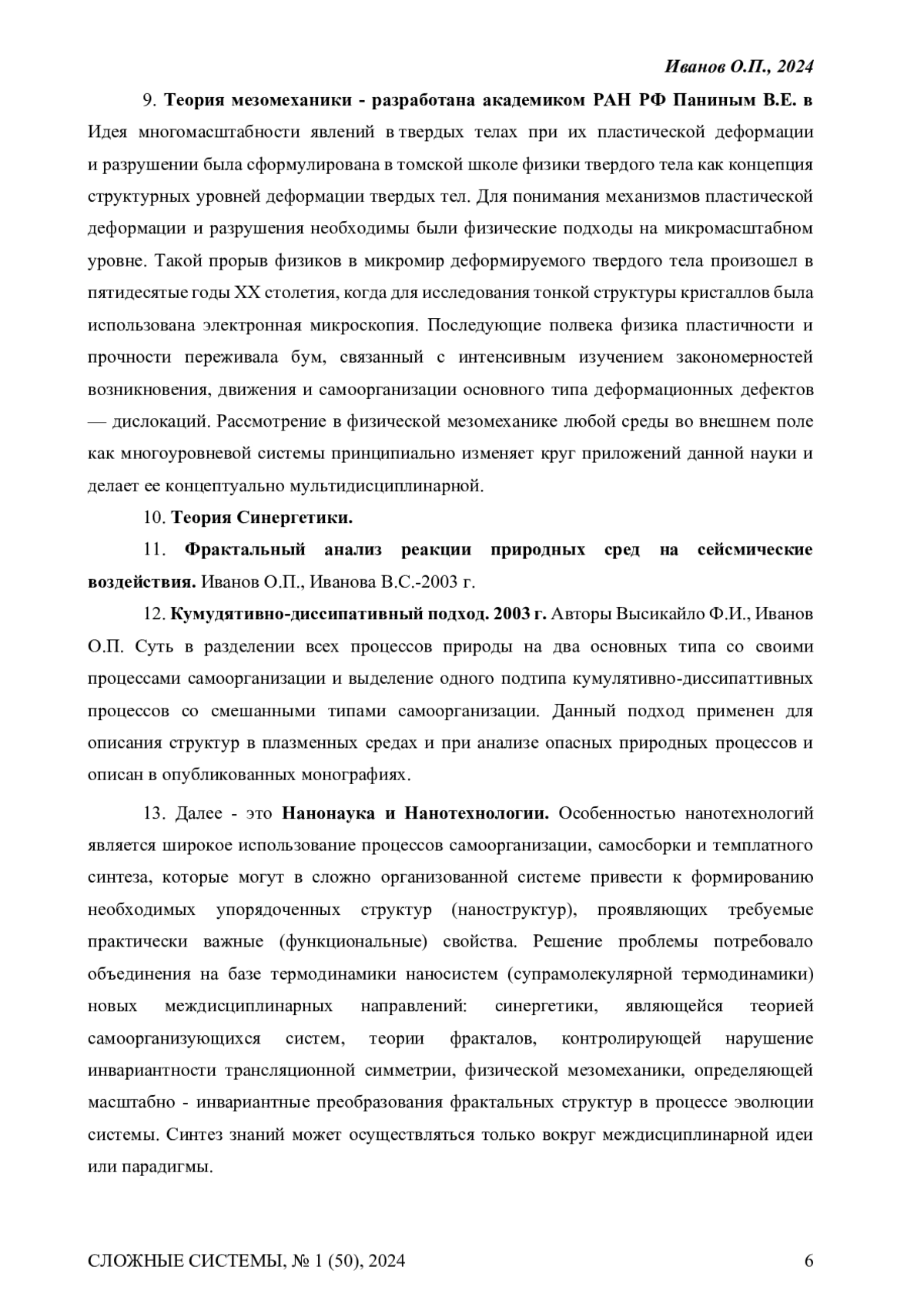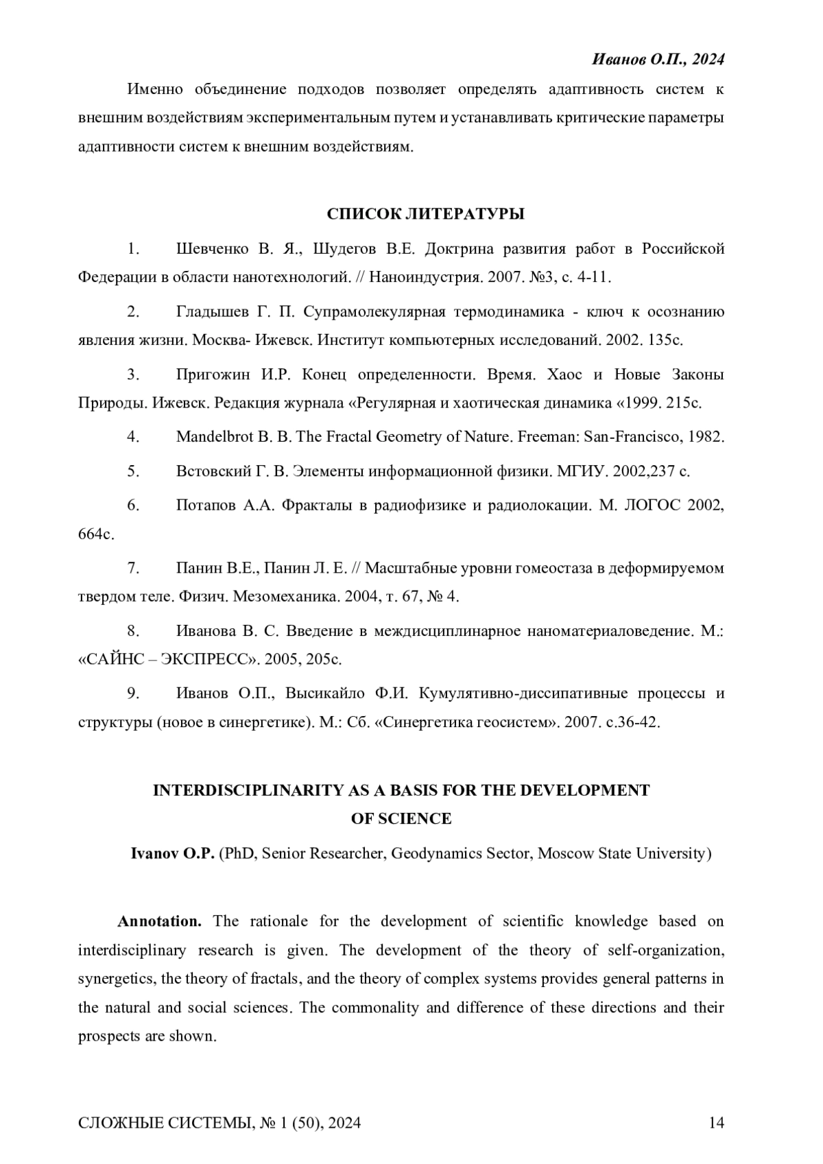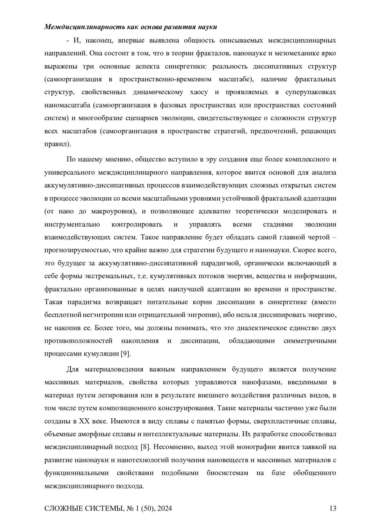 Дано обоснование пути развития научного познания на основе междисциплинарных исследований. Развитие теории самоорганизации, синергетики, теории фракталов, теории сложных систем дает общие закономерности в естественных и социальных науках. Показана общность и различие этих направлений и их перспективы.