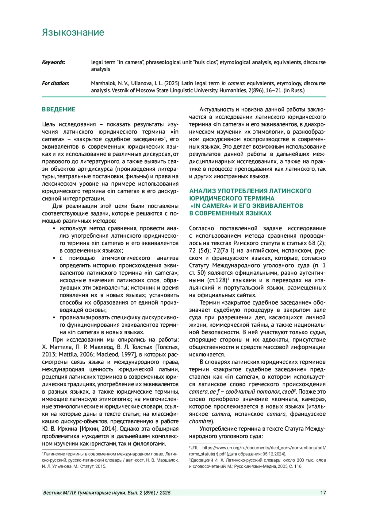 Целью данного исследования является изучение латинского юридического термина «in camera», его эквивалентов в современных языках и их использование в различных дискурсах, от юридического до литературного. Для этого был проведен анализ употребления термина «in camera» в тексте Римского статута на романских, а также русском и английском языках. Особое внимание уделено французскому юридическому языку, где в качестве эквивалента термина «in camera» используется фразеологизм «huis clos». Проведен этимологический анализ компонентов фразеологического выражения «huis clos», представлено его употребление в различных дискурс-направлениях, а также проанализирована дискурсивная интепретация «huis clos» как юридического термина в пьесе Сартра. Работа выполнена на основе методов сравнения, этимологического анализа и дискурс-анализа, ее результаты могут быть использованы в междисциплинарных исследованиях, а также на занятиях по иностранным языкам.