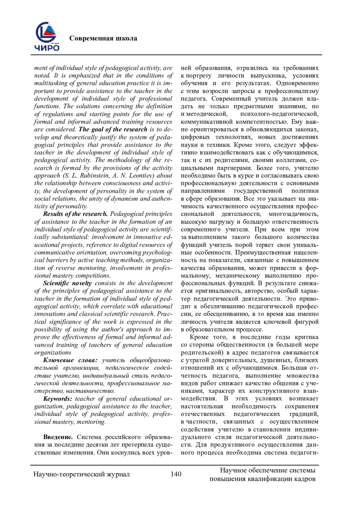 Проблема исследования и обоснование ее актуальности. Актуальность исследования связывается с поиском продуктивных подходов к обеспечению непрерывного профессионального развития учителя общеобразовательной организации. Отмечаются преимущества таких способов организации педагогической практики, которые основаны на совершенствовании индивидуального стиля педагогической деятельности. Подчеркивается, что в условиях многозадачности общеобразовательной практики важно обеспечить содействие учителю в становлении индивидуального стиля осуществления профессиональных функций. Перспективными для этого представляются решения, касающиеся определениях регламентов и исходных положений применения ресурсов формального и неформального повышения квалификации. Цель исследования состоит в разработке и теоретическом обосновании системы педагогических принципов, обеспечивающих содействие учителю в становлении индивидуального стиля педагогической деятельности. Методология (материалы и методы). Методологию исследования образуют положения деятельностного подхода (С. Л. Рубинштейна, А. Н. Леонтьева) о взаимосвязи сознания и деятельности, развитии личности в системе общественных отношений, единстве динамичности и аутентичности личности. Результаты исследования. Научно обоснованы педагогические принципы содействия учителю в становлении индивидуального стиля педагогической деятельности: вовлеченности в инновационные образовательные проекты, обращения к цифровым ресурсам коммуникативной направленности, преодоления психологических барьеров активными методами обучения, организации реверсивного наставничества, привлечения к участию в конкурсах профессионального мастерства. Научная новизна заключается в разработке принципов педагогического содействия учителю в становлении индивидуального стиля педагогической деятельности, которые соотносятся с образовательными инновациями и классическими научными исследованиями. Практическая значимость работы выражается в возможности применения авторского подхода для повышения эффективности формального и неформального повышения квалификации учителей общеобразовательных организаций.