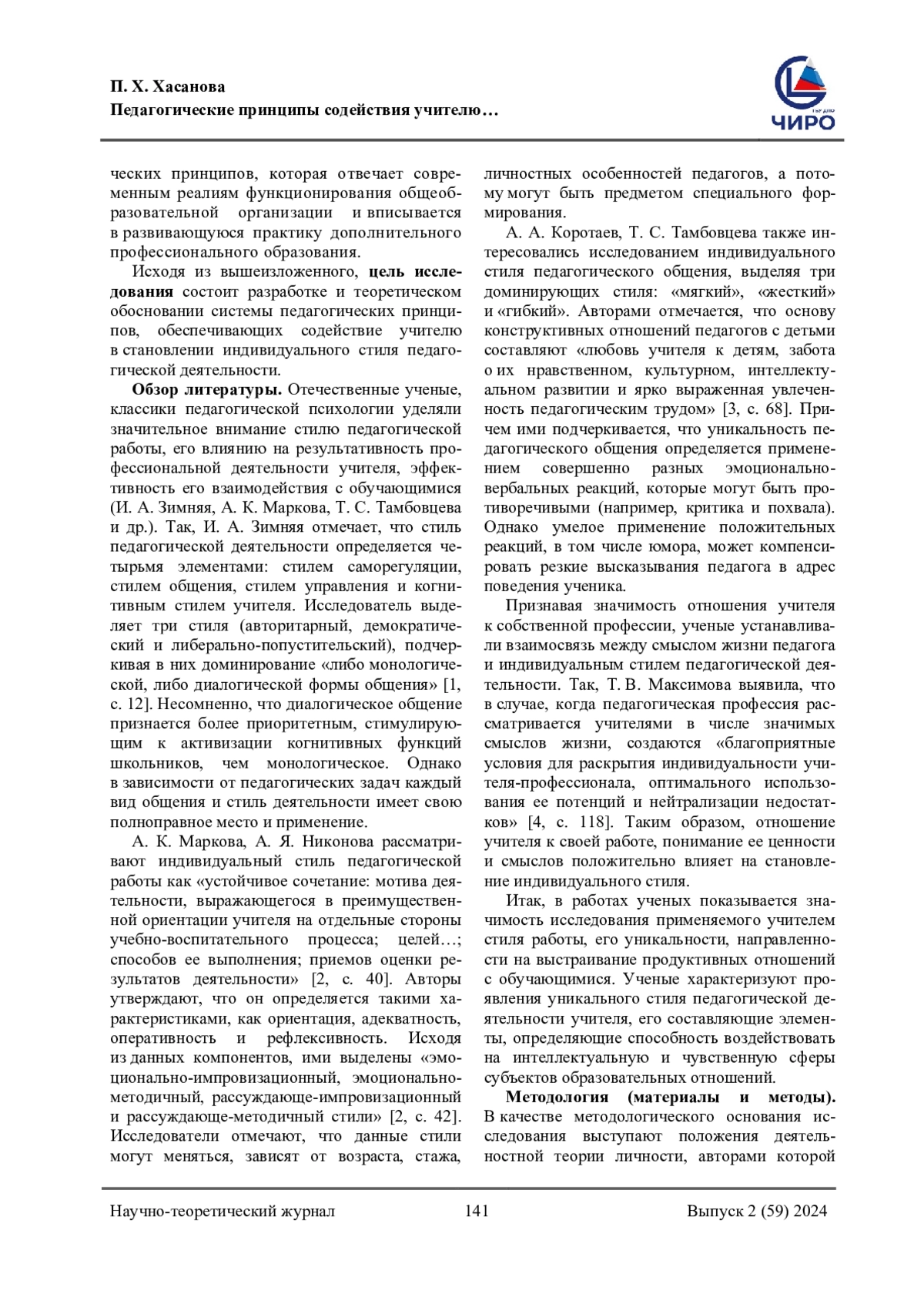 ХАСАНОВА П.Х. ПЕДАГОГИЧЕСКИЕ ПРИНЦИПЫ СОДЕЙСТВИЯ УЧИТЕЛЮ В СТАНОВЛЕНИИ ИНДИВИДУАЛЬНОГО СТИЛЯ ПЕДАГОГИЧЕСКОЙ ДЕЯТЕЛЬНОСТИ // НАУЧНОЕ ОБЕСПЕЧЕНИЕ СИСТЕМЫ ПОВЫШЕНИЯ КВАЛИФИКАЦИИ КАДРОВ. 2024. № 2 (59)