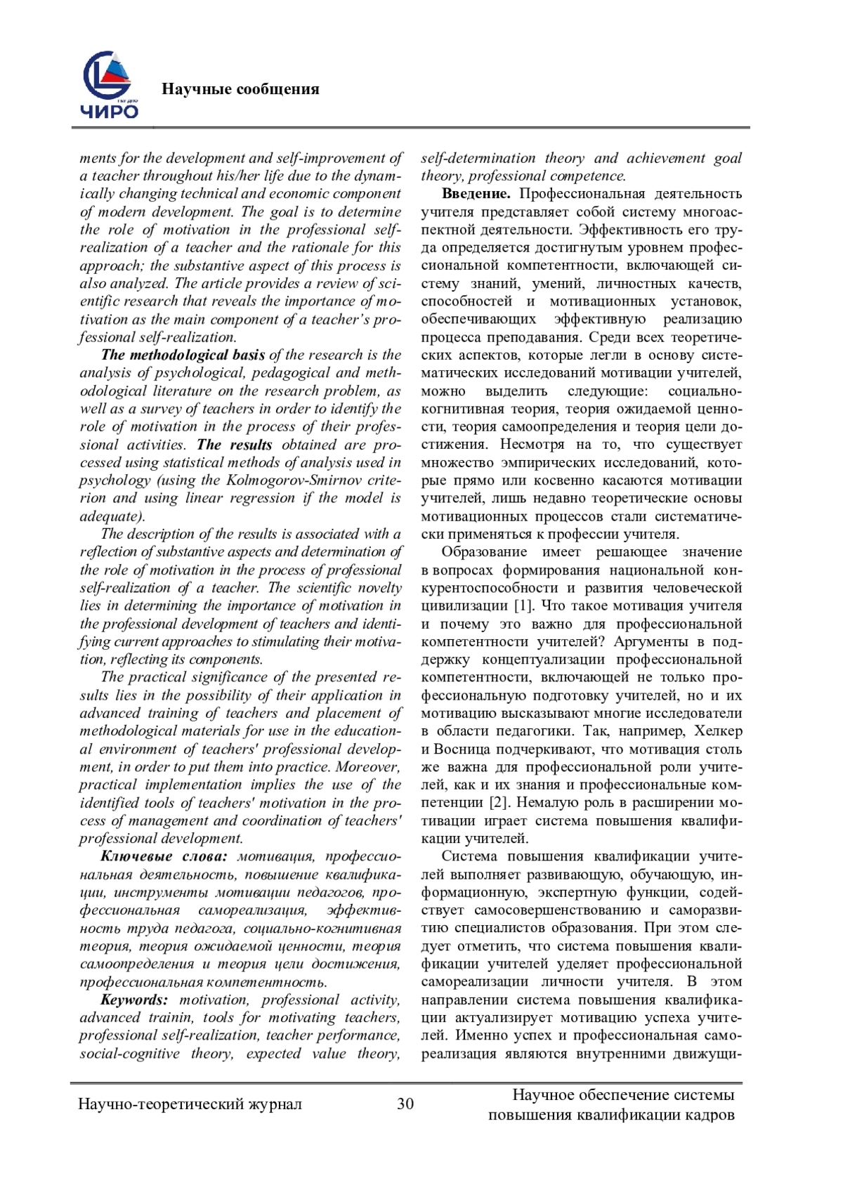 Ключевые фразы: мотивация, ПРОФЕССИОНАЛЬНАЯ ДЕЯТЕЛЬНОСТЬ, повышение квалификации, инструменты мотивации педагогов, профессиональная самореализация, эффективность труда педагога, социально-когнитивная теория, теория ожидаемой ценности, теория самоопределения и теория цели достижения, ПРОФЕССИОНАЛЬНАЯ КОМПЕТЕНТНОСТЬ