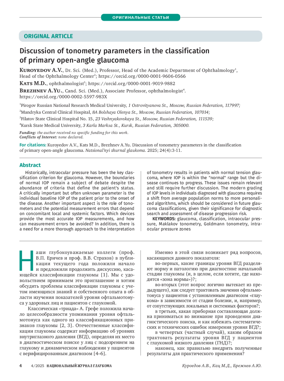 КУРОЕДОВ А. В., БРЕЖНЕВ А. Ю., КАЦ М.Д. ОБСУЖДЕНИЕ ПОКАЗАТЕЛЕЙ ОФТАЛЬМОТОНОМЕТРИИ В КЛАССИФИКАЦИИ ПЕРВИЧНОЙ ОТКРЫТОУГОЛЬНОЙ ГЛАУКОМЫ // НАЦИОНАЛЬНЫЙ ЖУРНАЛ ГЛАУКОМА. 2025. № 4, ТОМ 24
