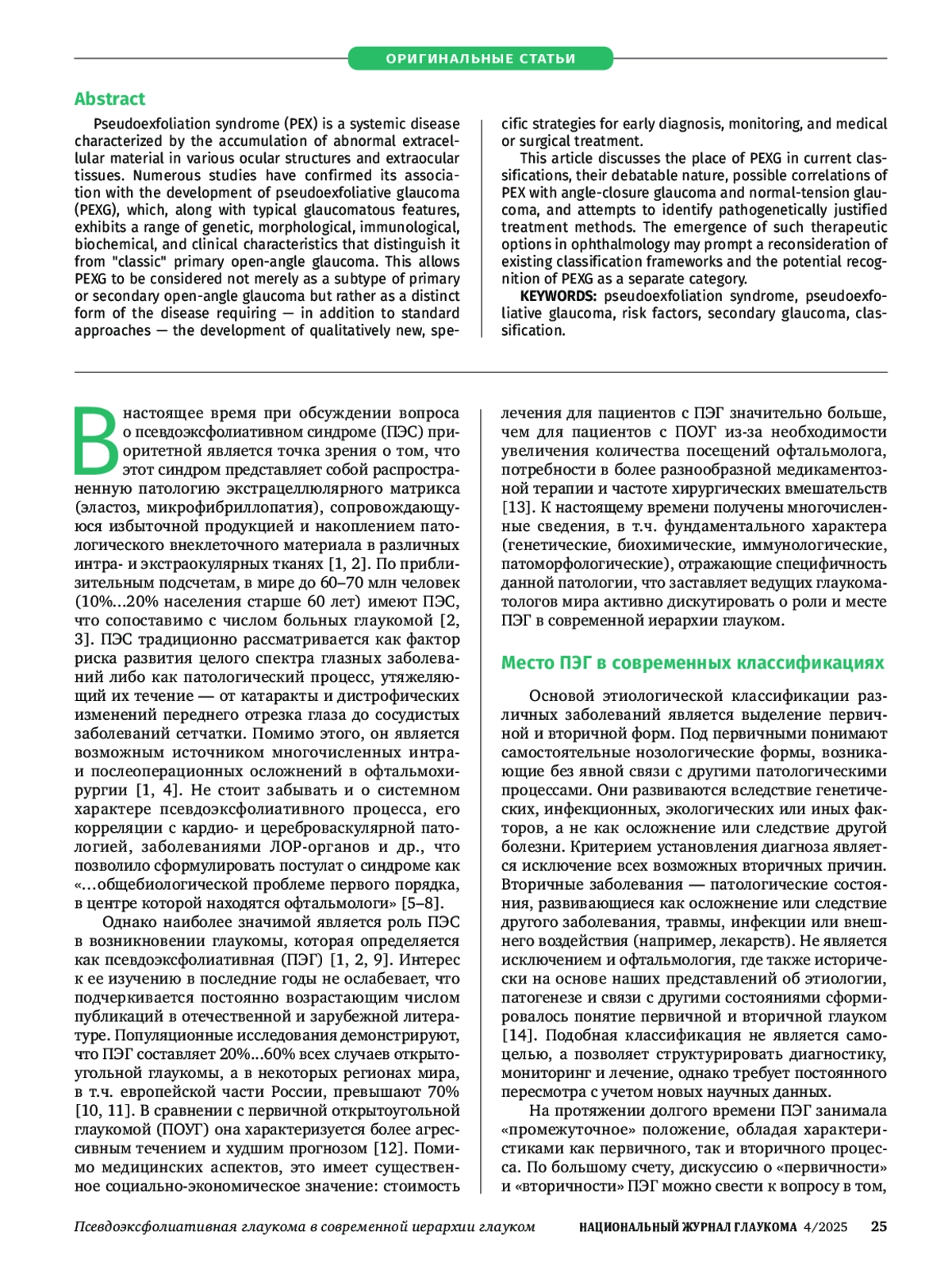 Псевдэксфолиативный синдром (ПЭС) — системное заболевание, характеризующееся накоплением аномального внеклеточного материала в различных структурах глаза и экстраокулярных тканях. Многочисленные исследования подтверждают его связь с развитием псевдэксфолиативной глаукомы (ПЭГ), которая наряду с типичными характеристиками глауком имеет целый ряд генетических, морфологических, иммунологических, биохимических, клинических особенностей, отличающих ее от «классической» первичной открытоугольной глаукомы. Это позволяет рассматривать ПЭГ не просто как разновидность первичной или вторичной открытоугольной глаукомы, а как особую форму заболевания, требующую, помимо стандартных технологий, разработки качественно новых, специфичных подходов к ранней диагностике, мониторингу, медикаментозной и хирургической коррекции.