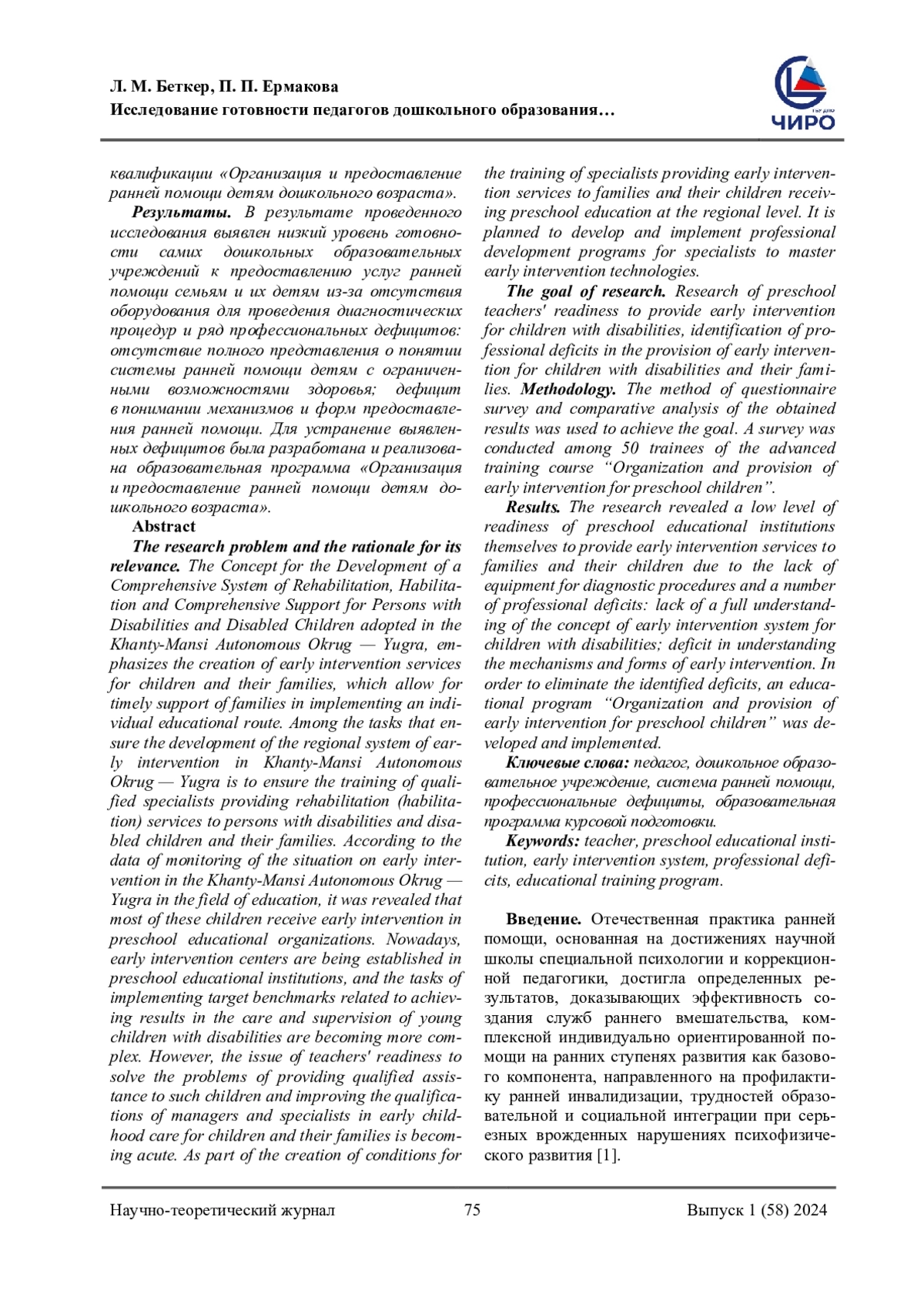 БЕТКЕР Н. Л., ЕРМАКОВА П.П. ИССЛЕДОВАНИЕ ГОТОВНОСТИ ПЕДАГОГОВ ДОШКОЛЬНОГО ОБРАЗОВАНИЯ К ОКАЗАНИЮ РАННЕЙ ПОМОЩИ ДЕТЯМ С ОГРАНИЧЕННЫМИ ВОЗМОЖНОСТЯМИ ЗДОРОВЬЯ // НАУЧНОЕ ОБЕСПЕЧЕНИЕ СИСТЕМЫ ПОВЫШЕНИЯ КВАЛИФИКАЦИИ КАДРОВ. 2024. № 1 (58)
