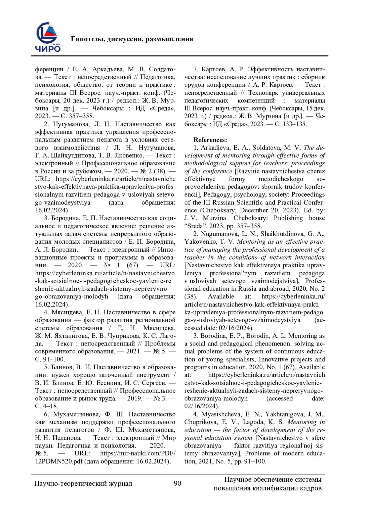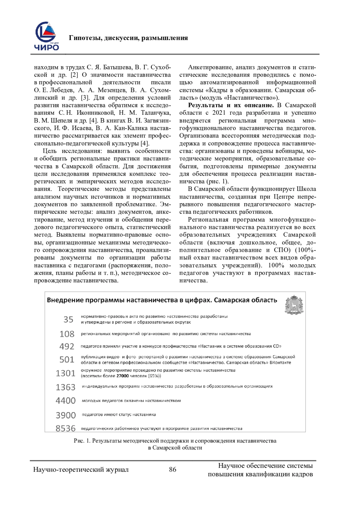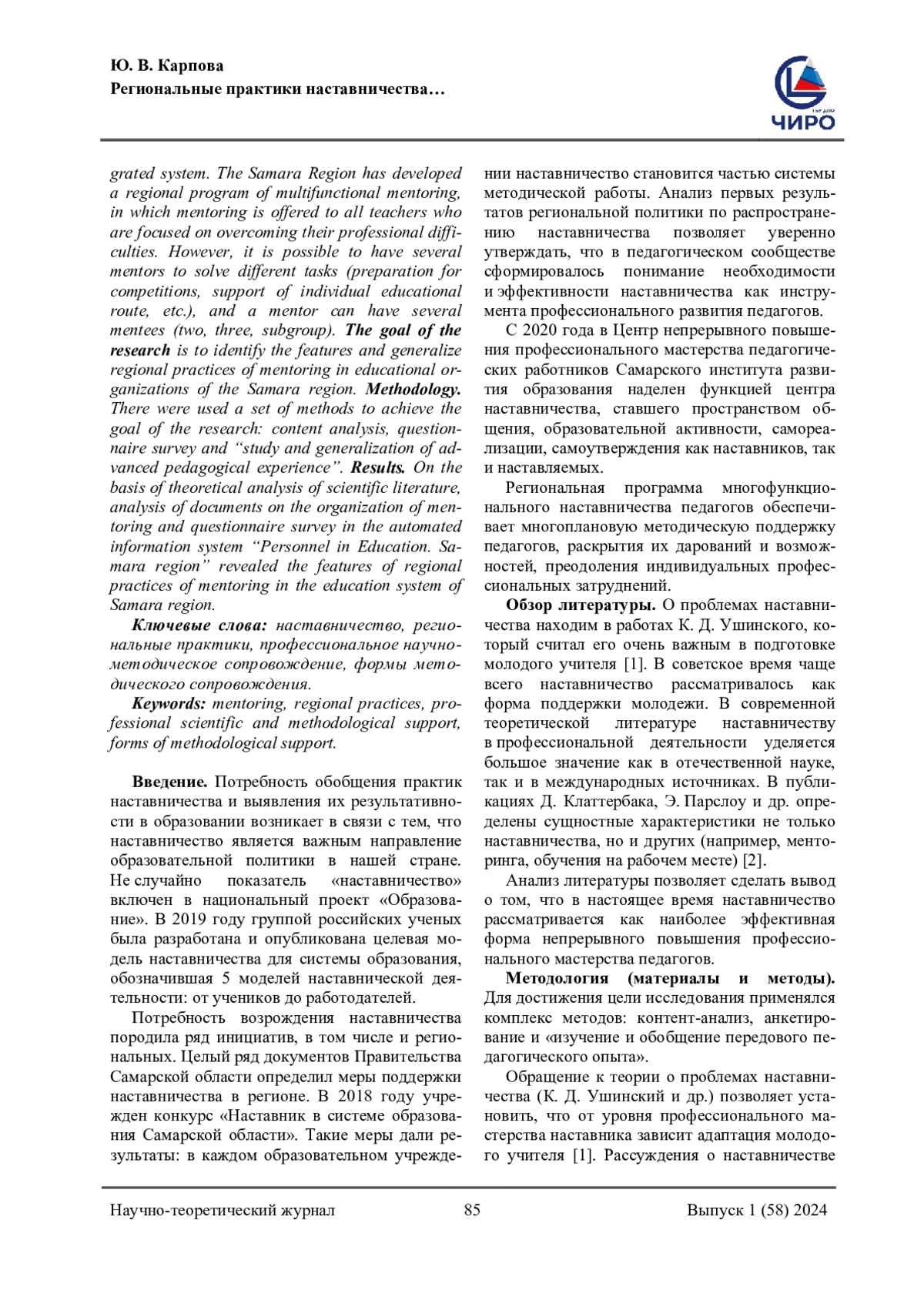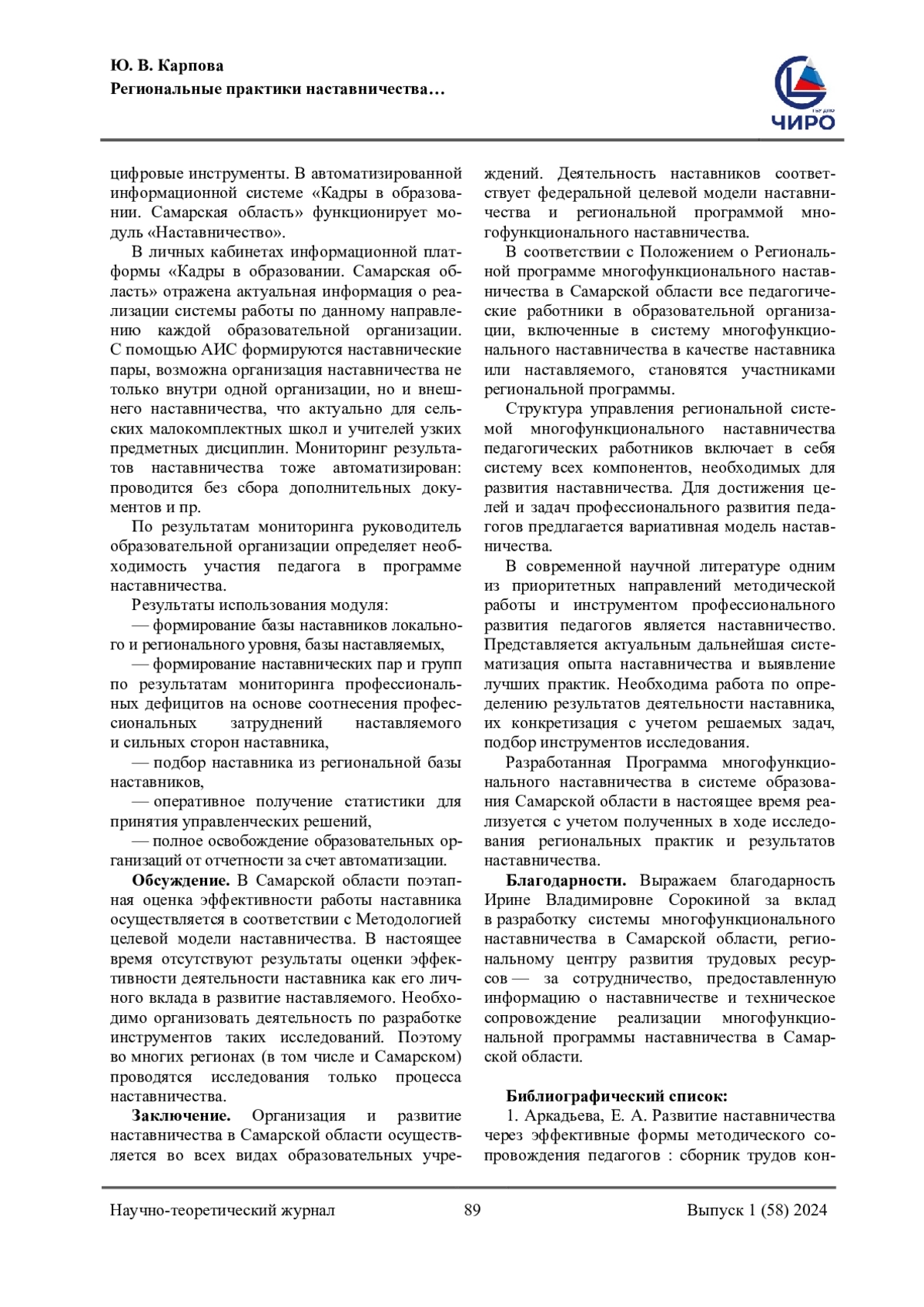 КАРПОВА Ю.В. РЕГИОНАЛЬНЫЕ ПРАКТИКИ НАСТАВНИЧЕСТВА НА ПРИМЕРЕ ОБРАЗОВАТЕЛЬНЫХ ОРГАНИЗАЦИЙ САМАРСКОЙ ОБЛАСТИ // НАУЧНОЕ ОБЕСПЕЧЕНИЕ СИСТЕМЫ ПОВЫШЕНИЯ КВАЛИФИКАЦИИ КАДРОВ. 2024. № 1 (58)