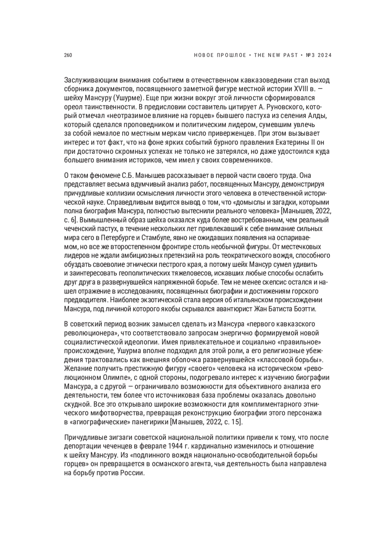 Заслуживающим внимания событием в отечественном кавказоведении стал выход сборника документов, посвященного заметной фигуре местной истории XVIII в. — шейху Мансуру (Ушурме). Еще при жизни вокруг этой личности сформировался ореол таинственности. В предисловии составитель цитирует А. Руновского, который отмечал «неотразимое влияние на горцев» бывшего пастуха из селения Алды, который сделался проповедником и политическим лидером, сумевшим увлечь за собой немалое по местным меркам число приверженцев. При этом вызывает интерес и тот факт, что на фоне ярких событий бурного правления Екатерины II он при достаточно скромных успехах не только не затерялся, но даже удостоился куда большего внимания историков, чем имел у своих современников