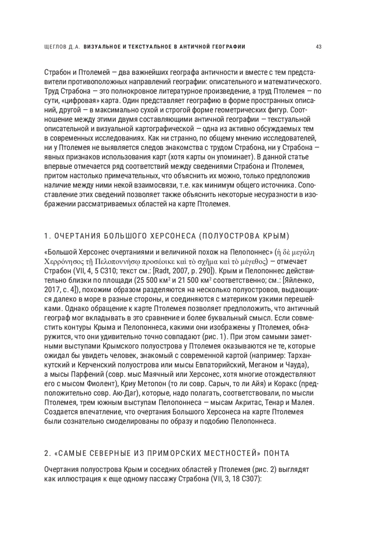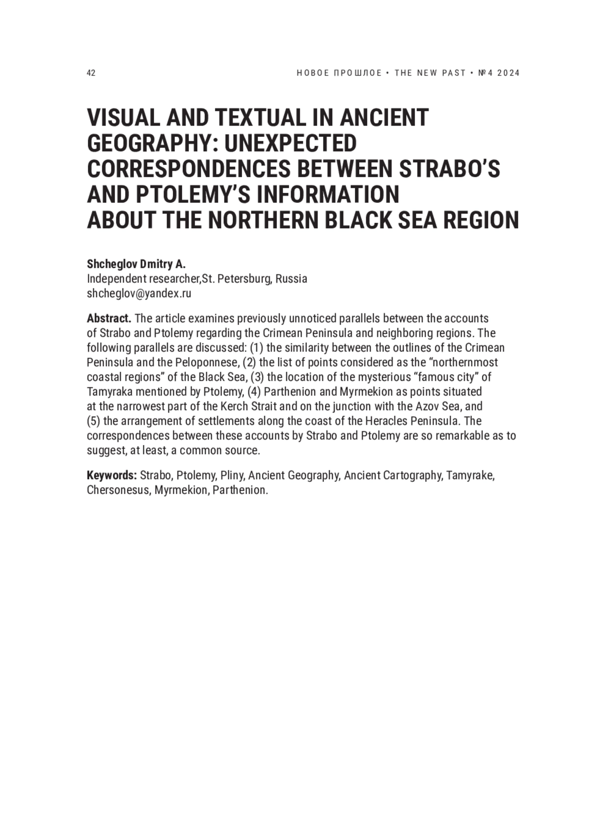 ЩЕГЛОВ Д. А. ВИЗУАЛЬНОЕ И ТЕКСТУАЛЬНОЕ В АНТИЧНОЙ ГЕОГРАФИИ: НЕОЖИДАННЫЕ ПЕРЕКЛИЧКИ МЕЖДУ СВЕДЕНИЯМИ СТРАБОНА И ПТОЛЕМЕЯ О СЕВЕРНОМ ПРИЧЕРНОМОРЬЕ // НОВОЕ ПРОШЛОЕ. 2024. № 4