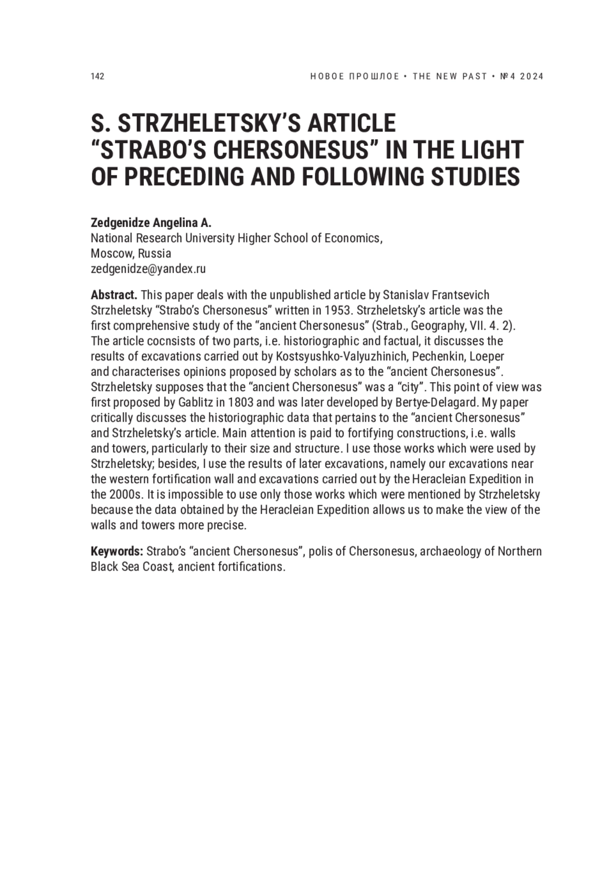ЗЕДГЕНИДЗЕ А.А. РАБОТА С. Ф. СТРЖЕЛЕЦКОГО «СТРАБОНОВ ХЕРСОНЕС» В СВЕТЕ ПРЕДЫДУЩИХ И ПОСЛЕДУЮЩИХ ИССЛЕДОВАНИЙ // НОВОЕ ПРОШЛОЕ. 2024. № 4