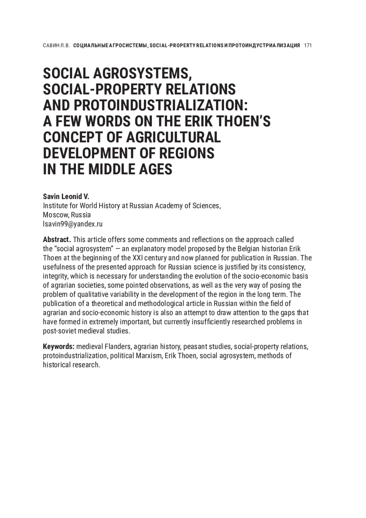 Данная статья предлагает отечественному читателю некоторые комментарии и размышления о подходе, именуемом «социальной агросистемой» — объяснительной модели, предложенной бельгийским историком Эриком Туном в начале XXI в. в одноименной статье 2004 г., ныне планируемой к публикации на русском языке. Полезность представленного подхода для отечественной науки обосновывается его системностью, цельностью, столь необходимой для осмысления эволюции социально-экономических порядков аграрных обществ, отдельными точечными наблюдениями, а также самим способом постановки проблемы качественной изменчивости развития региона в долгосрочной перспективе. Публикация теоретико-методической статьи на русском языке в области аграрной и социально-экономической истории является также попыткой привлечь внимание к образовавшимся лакунам в предельно важных, но ныне недостаточно исследуемых проблемах в отечественной медиевистике