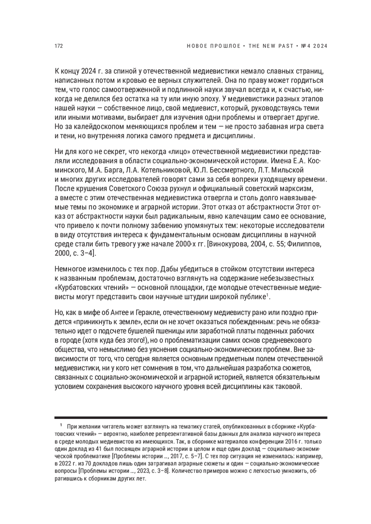 К концу 2024 г. за спиной у отечественной медиевистики немало славных страниц, написанных потом и кровью ее верных служителей. Она по праву может гордиться тем, что голос самоотверженной и подлинной науки звучал всегда и, к счастью, никогда не делился без остатка на ту или иную эпоху. У медиевистики разных этапов нашей науки — собственное лицо, свой медиевист, который, руководствуясь теми или иными мотивами, выбирает для изучения одни проблемы и отвергает другие. Но за калейдоскопом меняющихся проблем и тем — не просто забавная игра света и тени, но внутренняя логика самого предмета и дисциплины