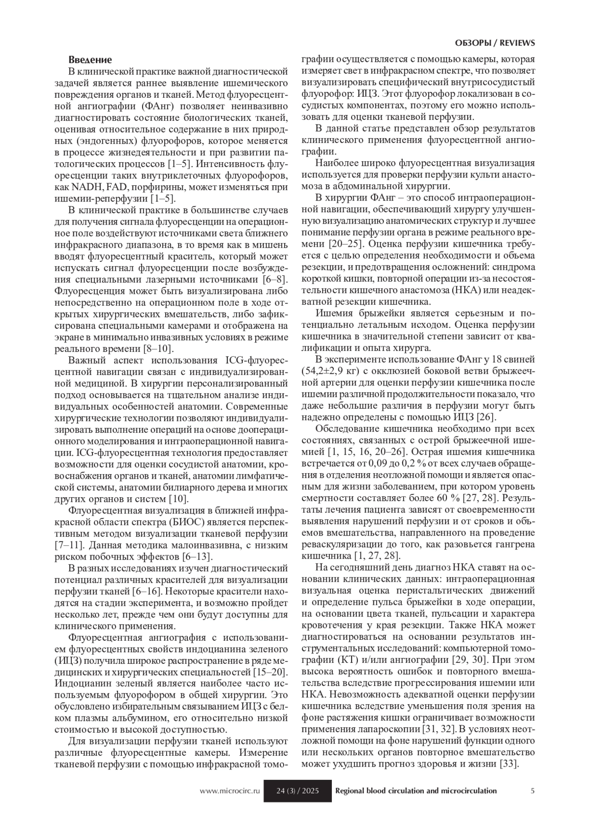 В клинической практике важной диагностической задачей является раннее выявление ишемического повреждения органов и тканей. Метод флуоресцентной ангиографии (ФАнг) позволяет неинвазивно диагностировать состояние биологических тканей, оценивая относительное содержание в них природных (эндогенных) флуорофоров, которое меняется в процессе жизнедеятельности и при развитии патологических процессов [1–5]. Интенсивность флуоресценции таких внутриклеточных флуорофоров, как NADH, FAD, порфирины, может изменяться при ишемии-реперфузии [1–5].