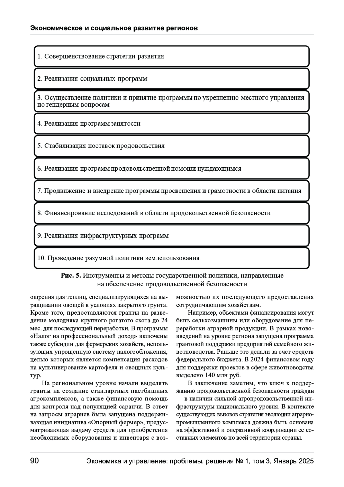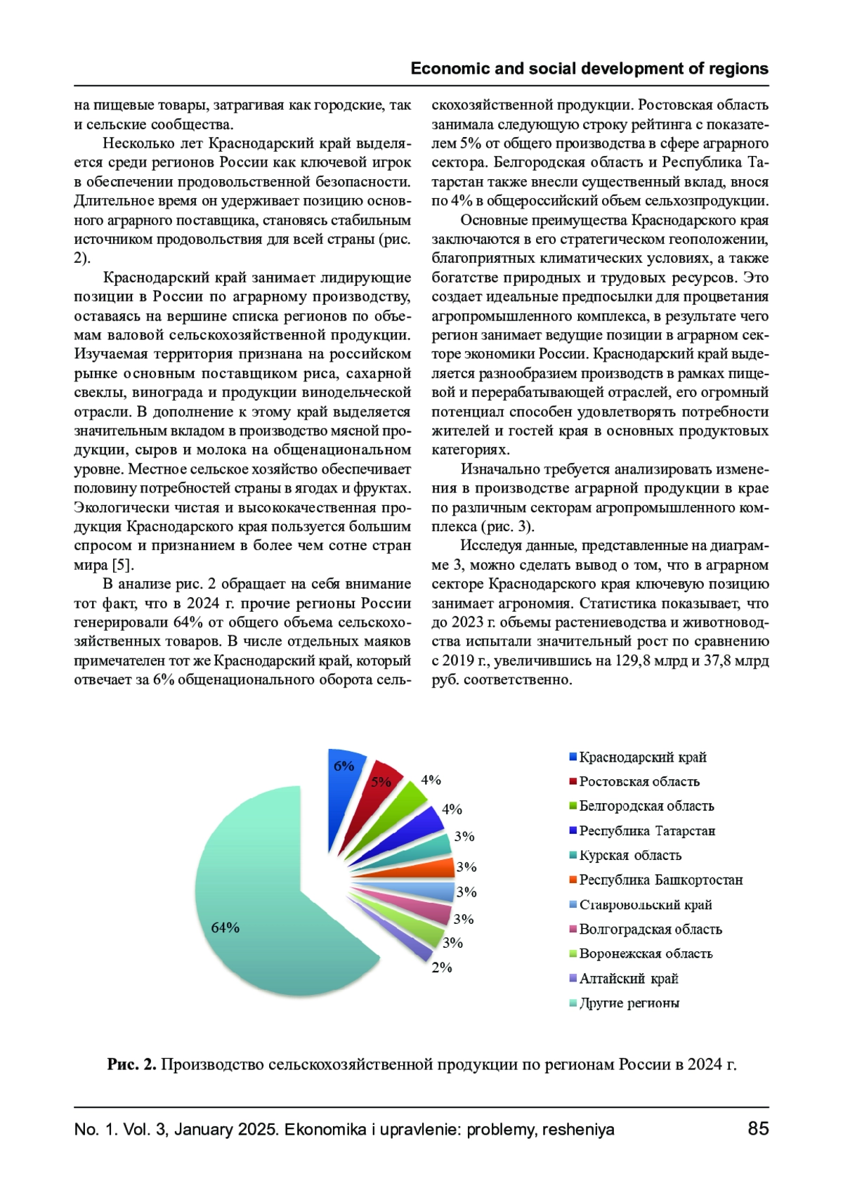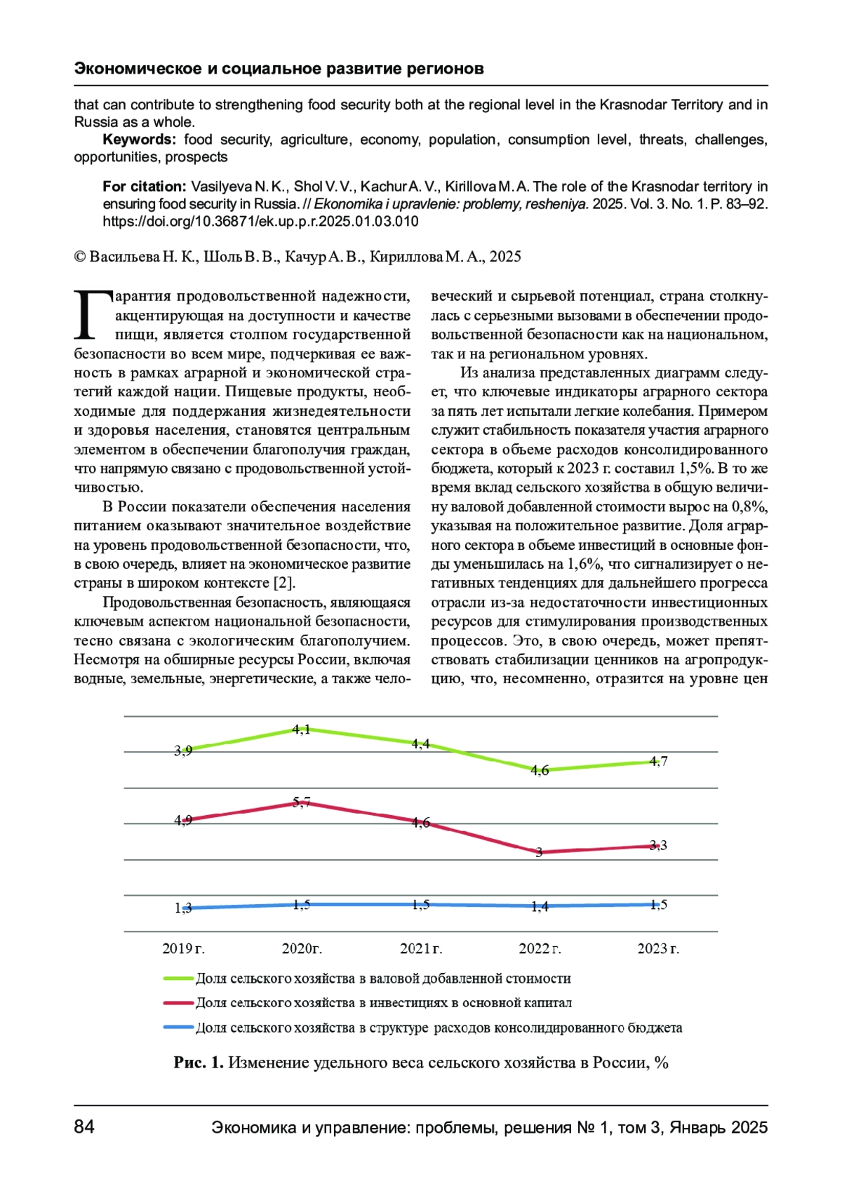 ВАСИЛЬЕВА Н. К., ШОЛЬ В. В., КАЧУР А. В., КИРИЛЛОВА М. А. РОЛЬ КРАСНОДАРСКОГО КРАЯ В ОБЕСПЕЧЕНИИ ПРОДОВОЛЬСТВЕННОЙ БЕЗОПАСНОСТИ РОССИИ // ЭКОНОМИКА И УПРАВЛЕНИЕ: ПРОБЛЕМЫ, РЕШЕНИЯ. 2025. ТОМ 3 № 1