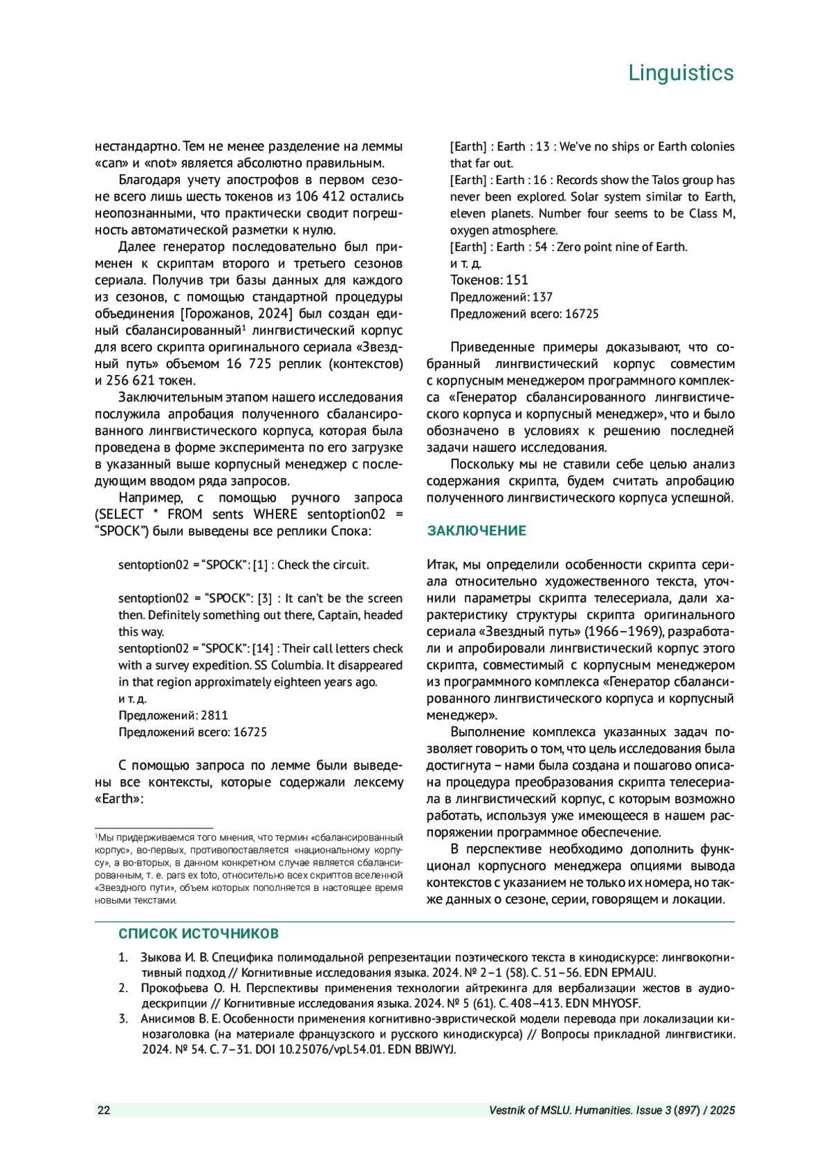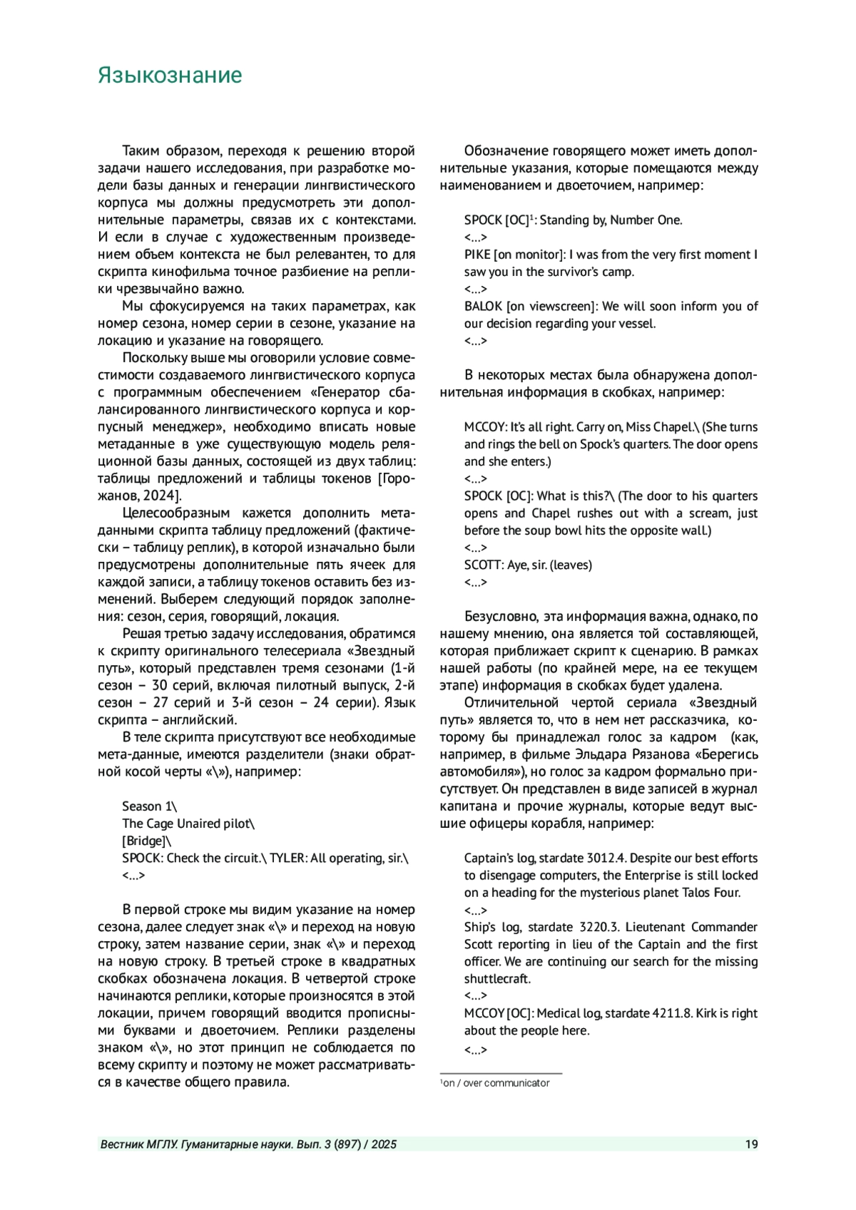 Цель исследования - описать типовую процедуру преобразования скрипта телесериала в лингвистический корпус, совместимый с программным комплексом «Генератор сбалансированного лингвистического корпуса и корпусный менеджер». Применяются методы сравнительного и структурного анализа, описания, профессионально ориентированного программирования, а также базовые методы корпусного подхода. В качестве лингвистического материала выступает скрипт оригинального телесериала «Звездный путь». В результате получен сбалансированный лингвистический корпус всех трех сезонов, содержащий помимо стандартных данных сведения о номере сезона и серии, говорящем и локации, в которой происходит действие.