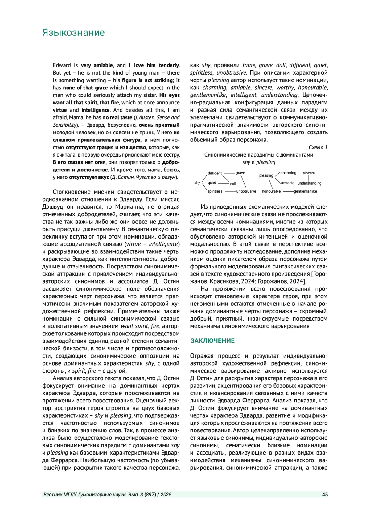 В статье исследуются особенности индивидуально-авторского синонимического варьирования при описании характера литературного персонажа в романе Д. Остин «Разум и чувство». Цель исследования - определить индивидуально-авторские особенности синонимического варьирования как процесса и результата авторской художественной рефлексии. Для выявления синонимических средств различной степени близости использовались такие методы, как лингвопрагматический, контекстуальный анализ и прагмааксиологическое моделирование, позволяющие эксплицировать противоречивый образ Эдварда Феррарса, выявить вектор его интерпретации читателем. В результате лингвопрагматического анализа осуществлено моделирование иерархически организованных текстовых синонимических парадигм, раскрывающих в авторской проекции концептуально значимые черты характера персонажа.
