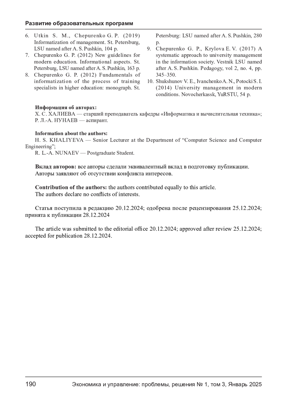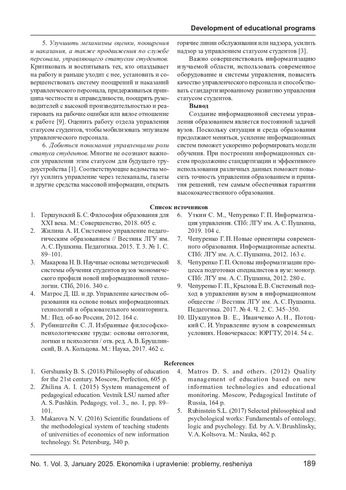 9. Чепуренко Г. П., Крылова Е. В. Системный подход в управлении вузом в информационном обществе // Вестник ЛГУ им. А. С. Пушкина. Педагогика. 2017. № 4. Ч. 2. С. 345-350.