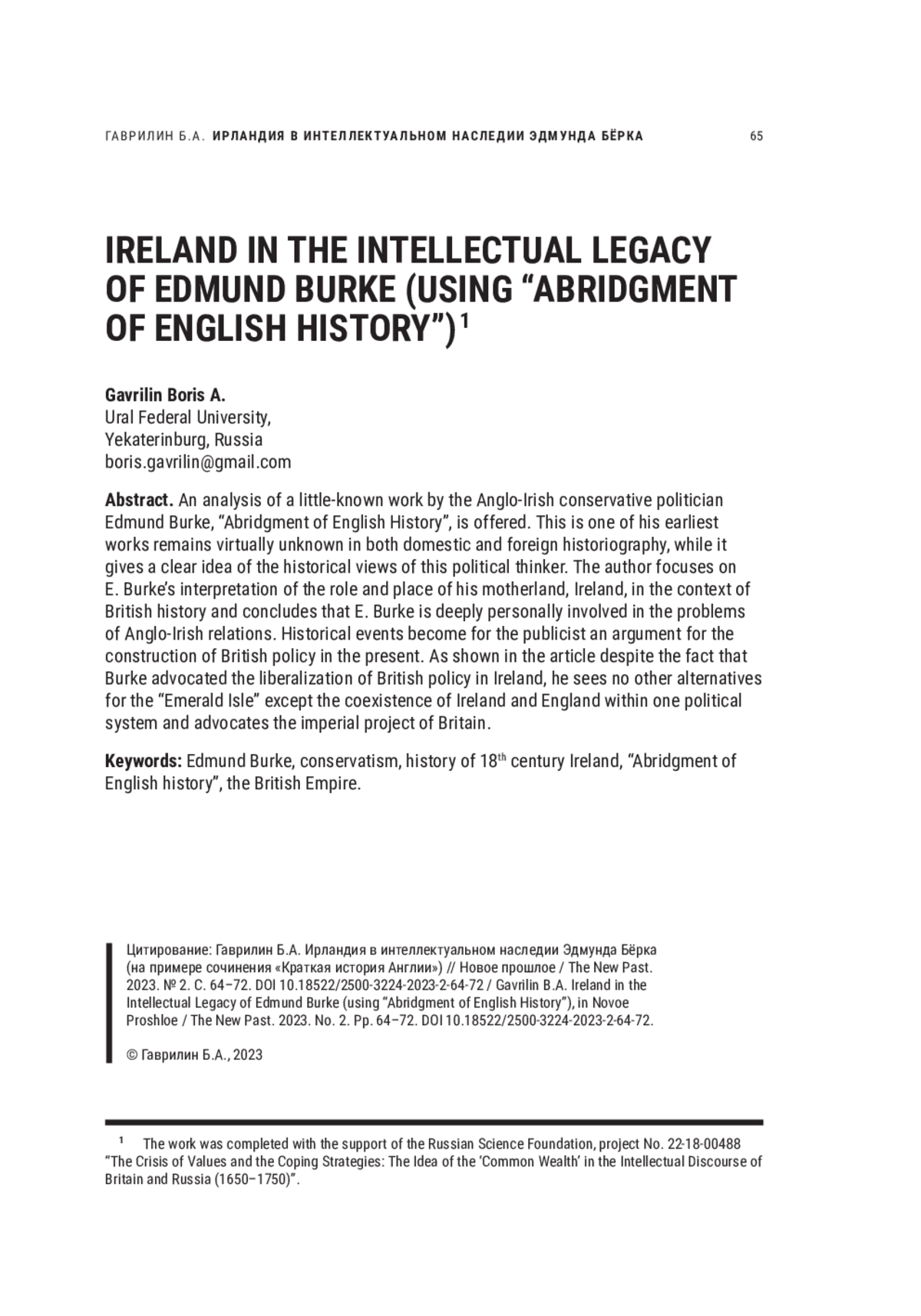 ГАВРИЛИН Б. А. ИРЛАНДИЯ В ИНТЕЛЛЕКТУАЛЬНОМ НАСЛЕДИИ ЭДМУНДА БЁРКА (НА ПРИМЕРЕ СОЧИНЕНИЯ "КРАТКАЯ ИСТОРИЯ АНГЛИИ") // НОВОЕ ПРОШЛОЕ. 2023. № 2
