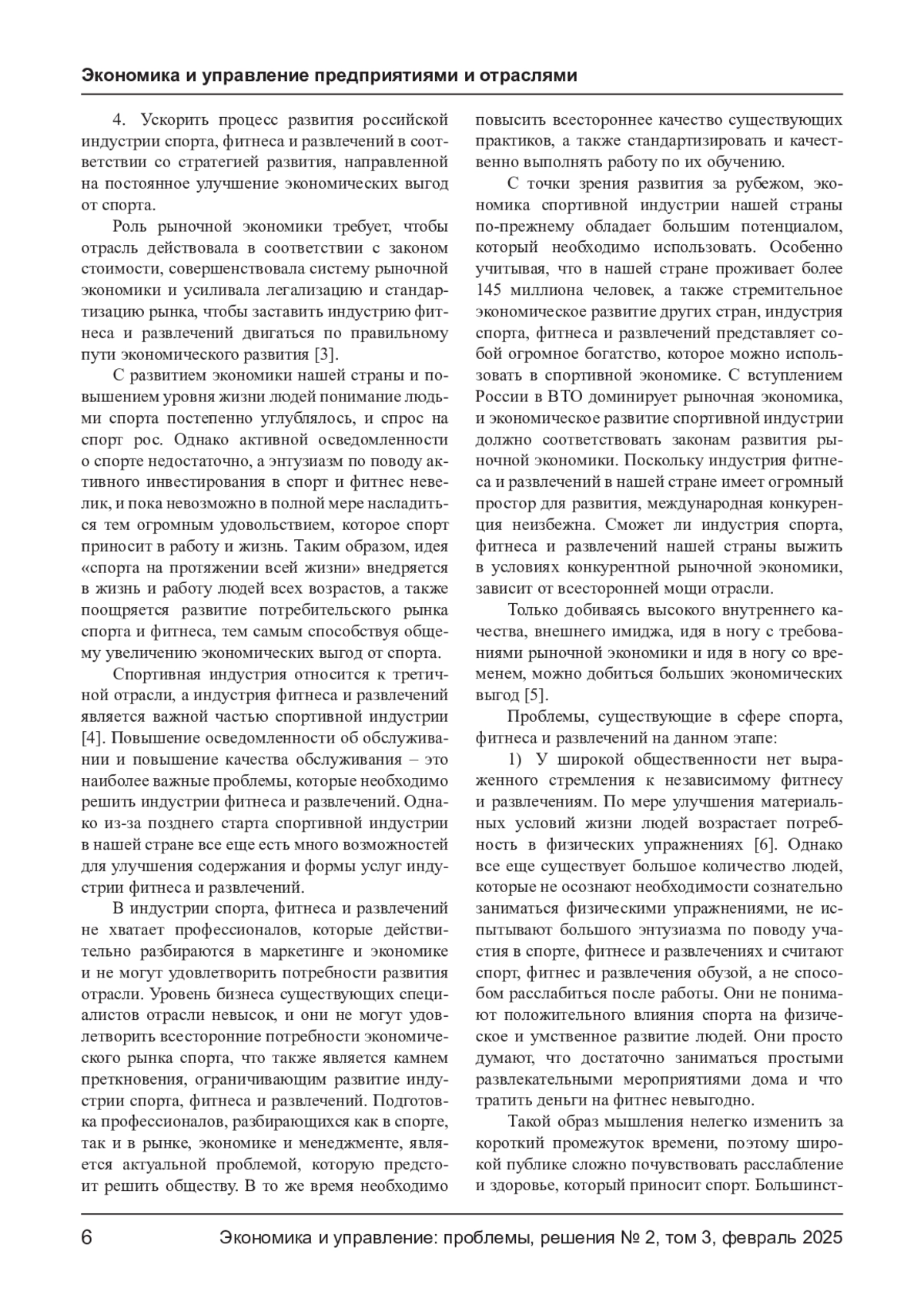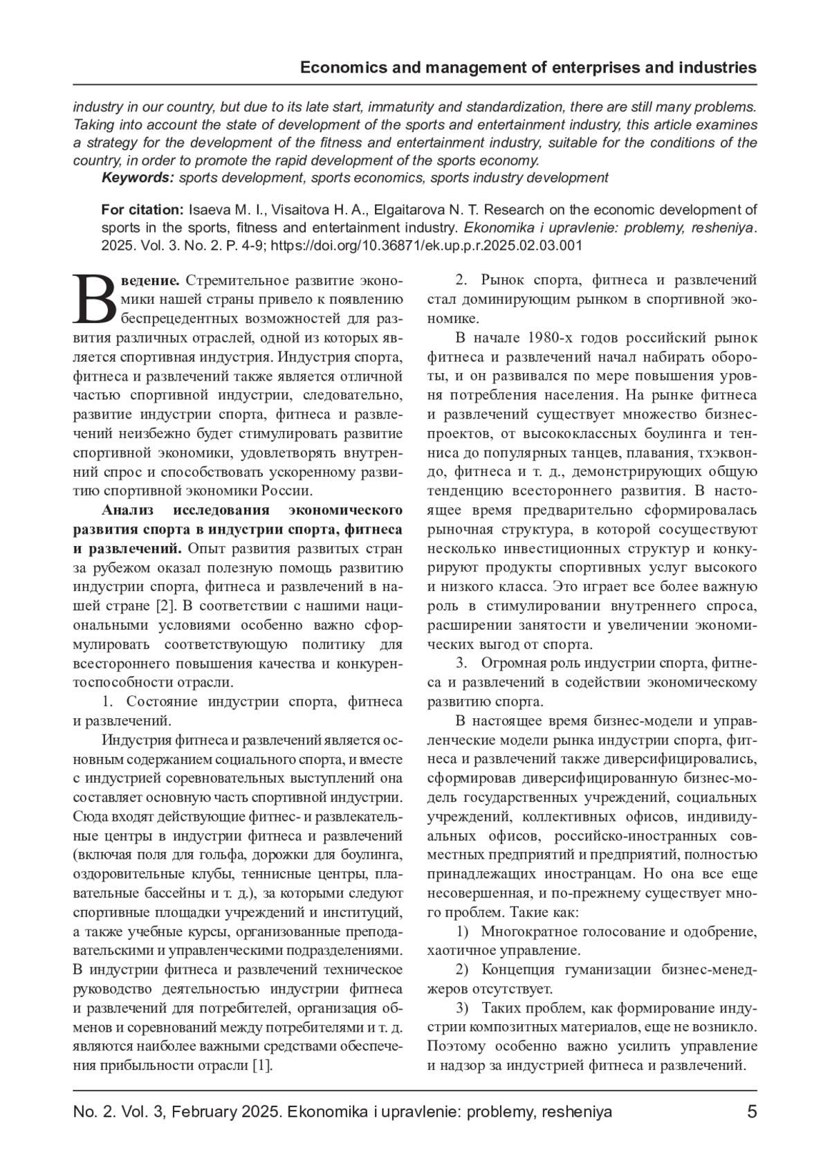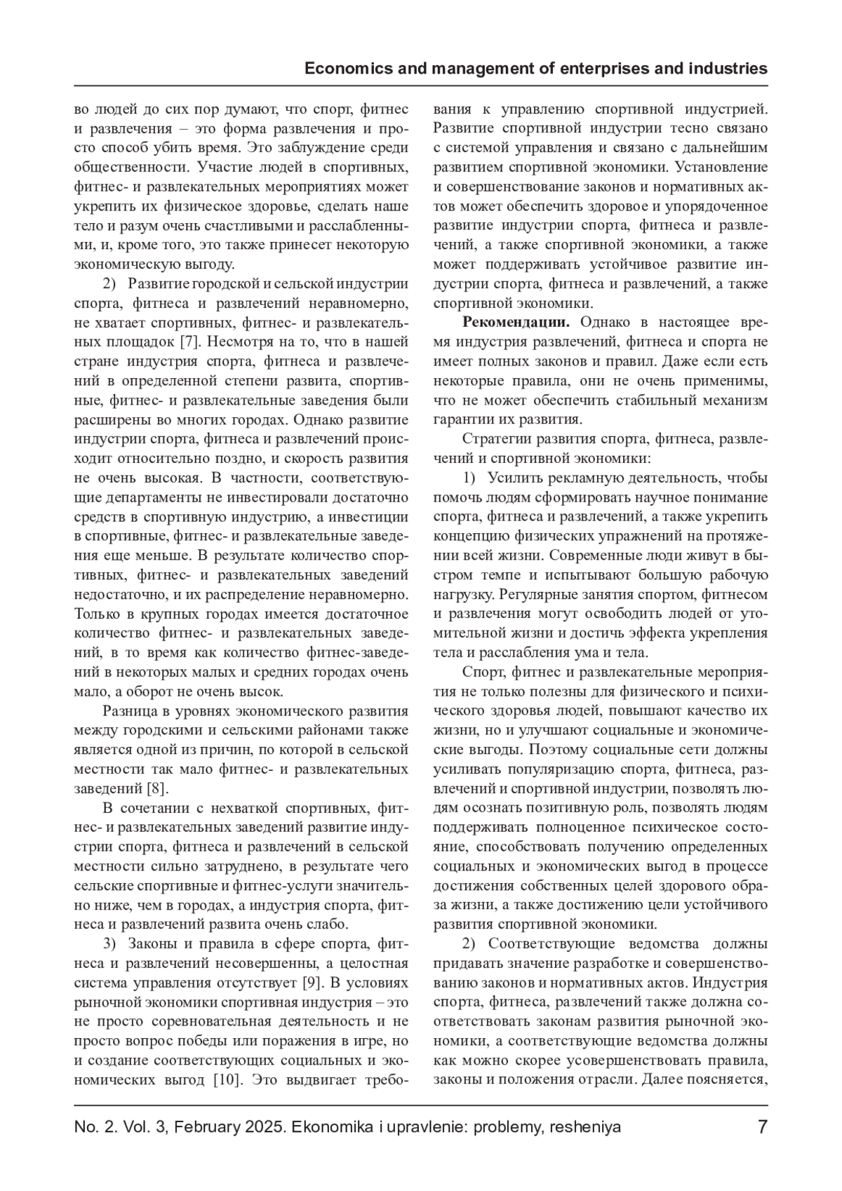 Статья посвящена анализу роли фитнес-индустрии в создании рабочих мест и поддержке малого предпринимательства. В работе рассматриваются механизмы, развития отрасли, включая государственную поддержку, цифровую трансформацию и современные бизнес-модели. В исследовании применяются статистический анализ, сравнительный подход, а также обзор современных экономических моделей управления фитнес-бизнесом. Авторы используют данные официальных источников, научных публикаций и отраслевой аналитики. Основные результаты исследования показывают, что фитнес-индустрия - важный источник занятости, обеспечивающий рабочими местами тренеров, административного персонала, маркетологов и специалистов в области цифровых технологий. Малый бизнес в этой сфере характеризуется высокой адаптивностью и гибкостью в реагировании на изменения рынка. Государственная поддержка в виде льготного налогообложения, субсидий и образовательных программ направлена на увеличение числа малых предприятий в фитнес-индустрии, за счет привлечения инвестиций в развитие спортивной инфраструктуры. Цифровизация влияет на развитие отрасли путем внедрения CRM-систем, онлайн-курсов, мобильных приложений и персонализированных тренировочных программ, оптимизируя управление бизнесом, расширяя клиентскую аудиторию и повышая конкурентоспособность организаций. В перспективе ожидается усиление роли цифровых технологий, развитие гибридных бизнес-моделей и расширение государственной поддержки, которые приведут к росту рынка фитнес-услуг.