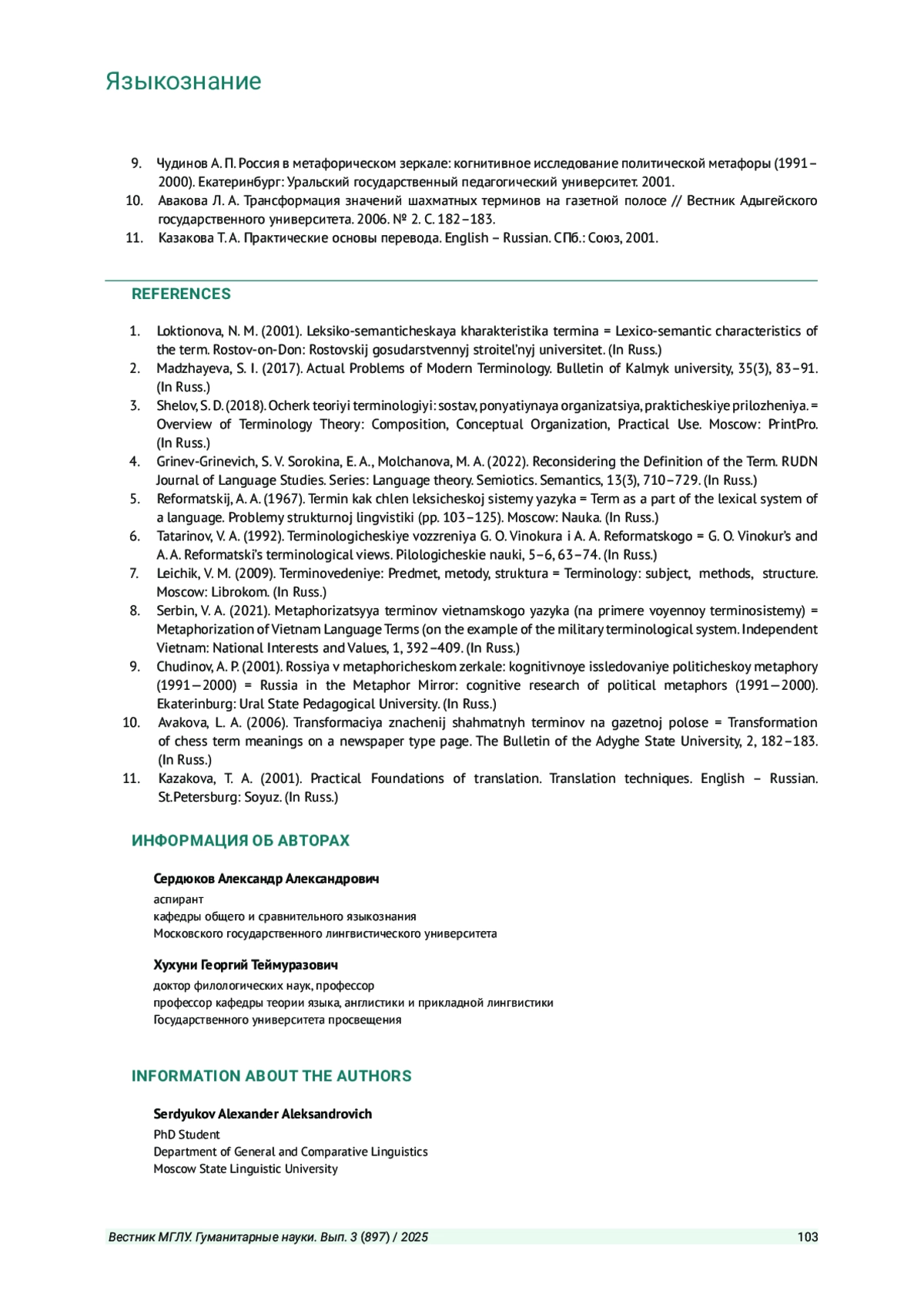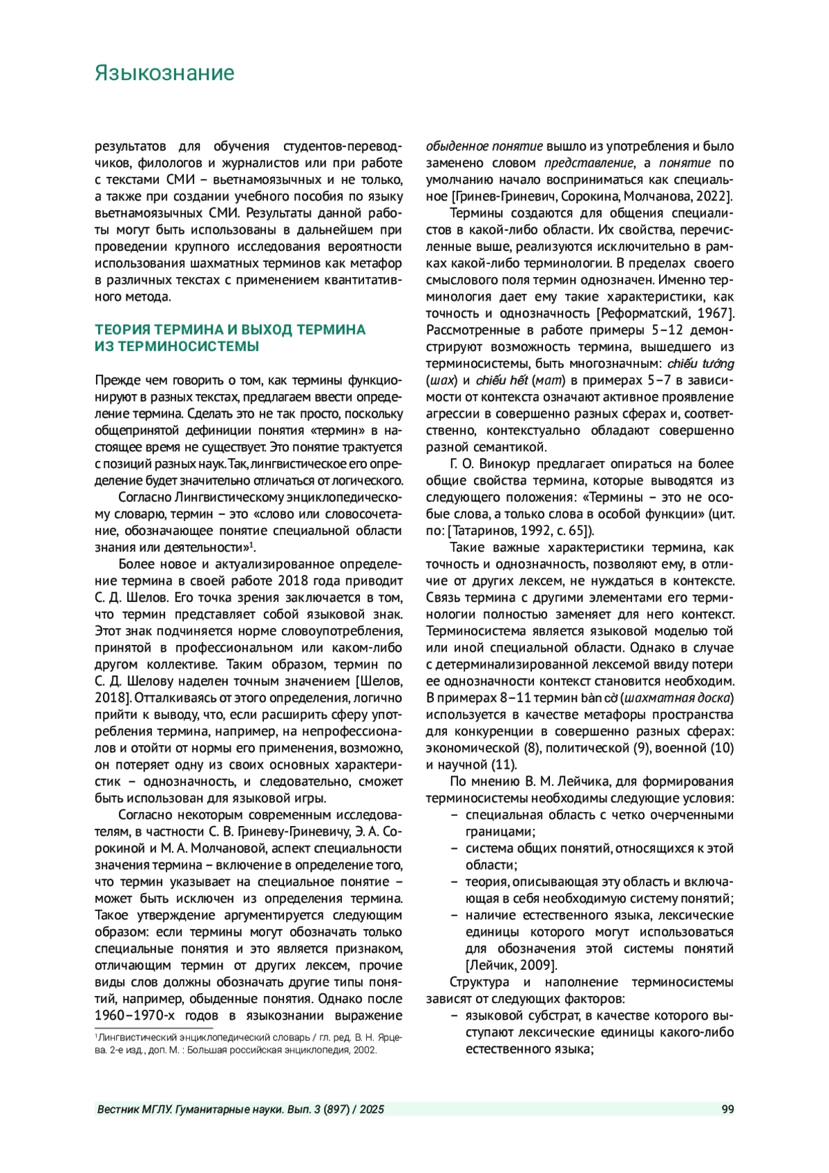 СЕРДЮКОВ А. А., ХУХУНИ Г. Т. ФУНКЦИОНИРОВАНИЕ ШАХМАТНЫХ ТЕРМИНОВ В КАЧЕСТВЕ МЕТАФОР В ТЕКСТАХ ЦИФРОВЫХ СМИ (НА МАТЕРИАЛЕ ВЬЕТНАМОЯЗЫЧНЫХ ЦИФРОВЫХ СМИ) // ВЕСТНИК МОСКОВСКОГО ГОСУДАРСТВЕННОГО ЛИНГВИСТИЧЕСКОГО УНИВЕРСИТЕТА. ГУМАНИТАРНЫЕ НАУКИ. 2025. № 3 (897)