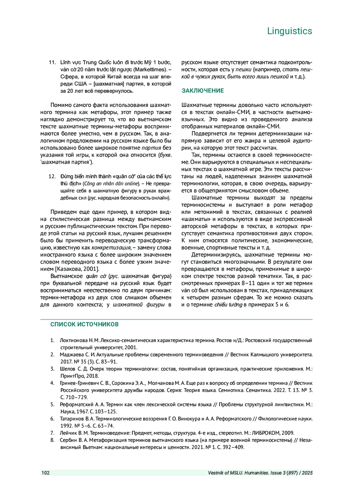 Статья: ФУНКЦИОНИРОВАНИЕ ШАХМАТНЫХ ТЕРМИНОВ В КАЧЕСТВЕ МЕТАФОР В ТЕКСТАХ ЦИФРОВЫХ СМИ (НА МАТЕРИАЛЕ ВЬЕТНАМОЯЗЫЧНЫХ ЦИФРОВЫХ СМИ) (2025)