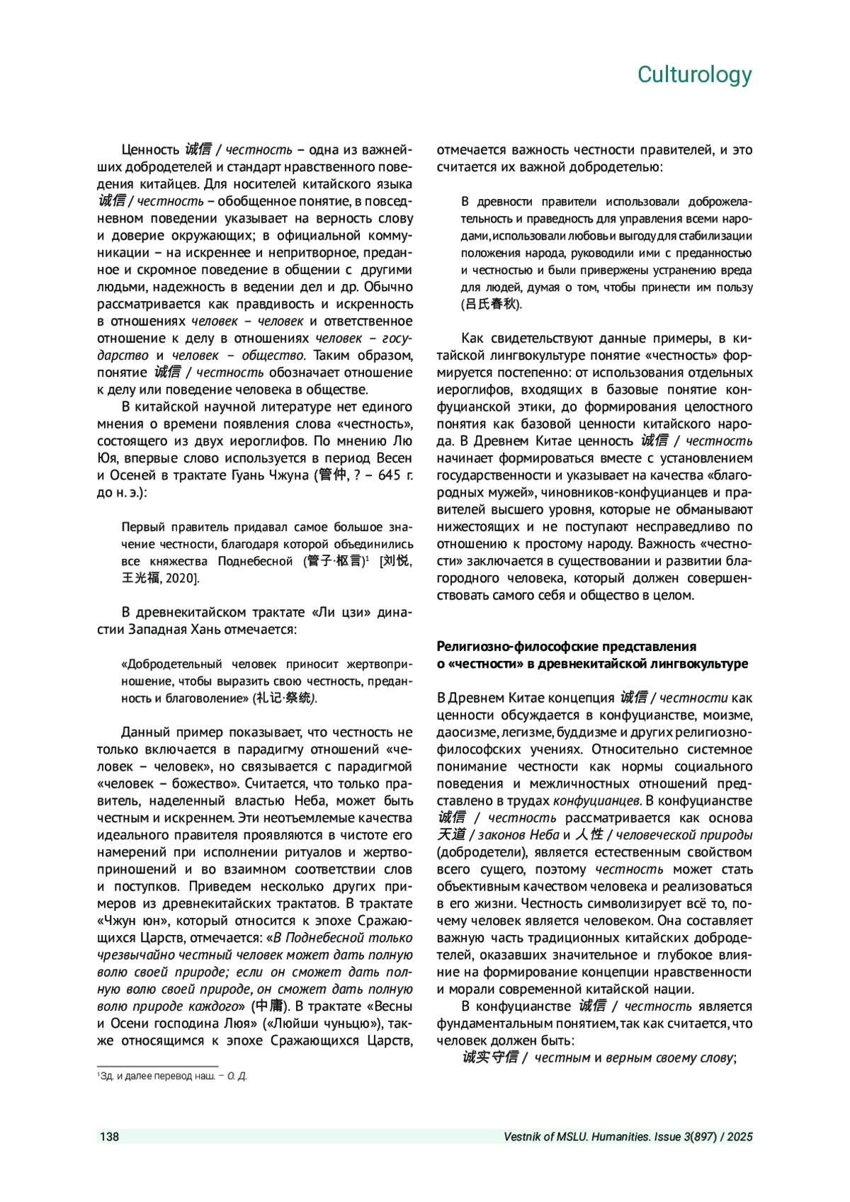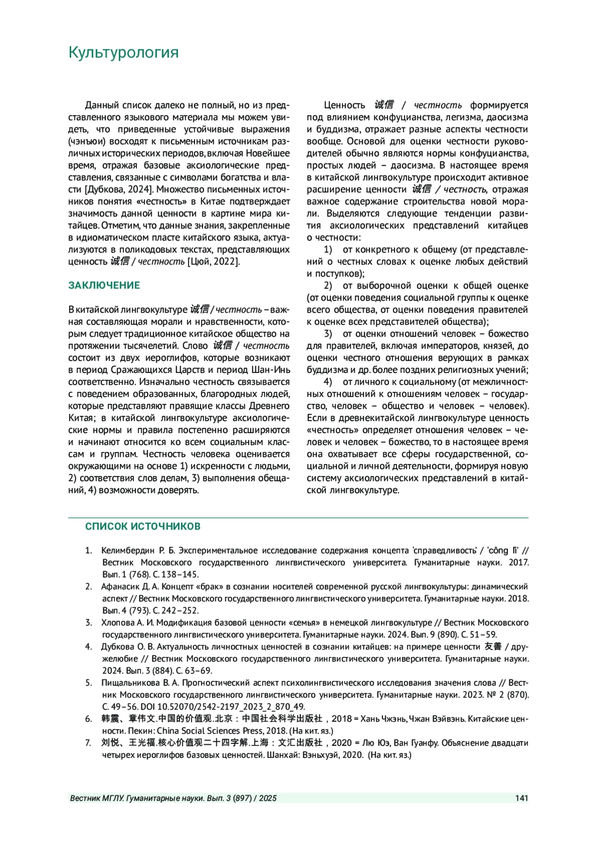 15. Дубкова О. В. Закономерности формирования базовых ценностей (на материале древнекитайской лингвокультуры) // Вестник Московского государственного лингвистического университета. Гуманитарные науки. 2024. Вып. 9 (890). С. 44-50. EDN: WCAWQU