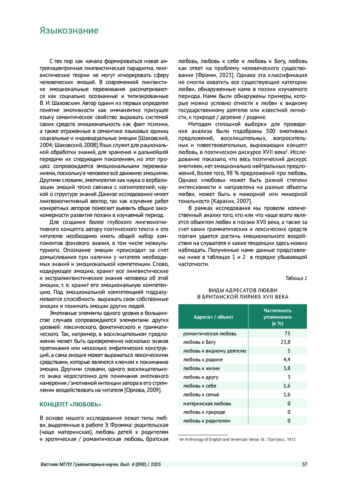 В статье рассматриваются содержательные особенности и дисперсия грамматических средств выражения концепта «любовь» в британском поэтическом дискурсе XVII века. Целью исследования было изучить репрезентацию категории эмотивности на материале 500 эмотивных предложений ранненовоанглийского периода. В работе были использованы методы контекстного анализа и количественных подсчетов. Автор приходит к выводу, что самой частотной конструкцией, репрезентирующей категорию эмотивности на синтаксическом уровне, оказалась восклицательное предложение с междометиями и восклицательными частицами в начале. Лексические средства рассматриваются автором как способ формирования у читателя определенного образа объекта любви.