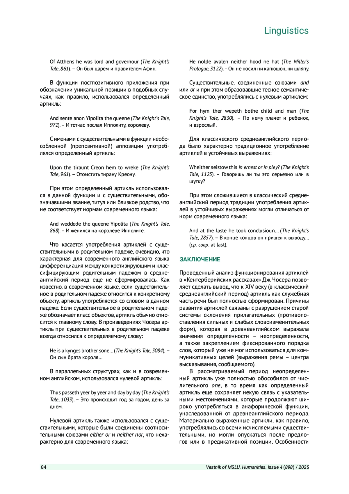 Целью исследования является изучение развития артикля как служебной части речи в истории английского языка, в частности, сравнение особенностей употребления артиклей в произведениях классического среднеанглийского периода с современными закономерностями. Основными методами исследования выступили функционально-семантический анализ и сравнительный анализ. Материалом для анализа послужили «Кентерберийские рассказы» Дж. Чосера. В статье проводится сравнительный анализ семантических функций артиклей в среднеанглийский и современный периоды. Особое внимание уделяется особенностям употребления артиклей с различными семантическими группами существительных и их сопоставлению с нормами, закрепившимися в современном английском языке.