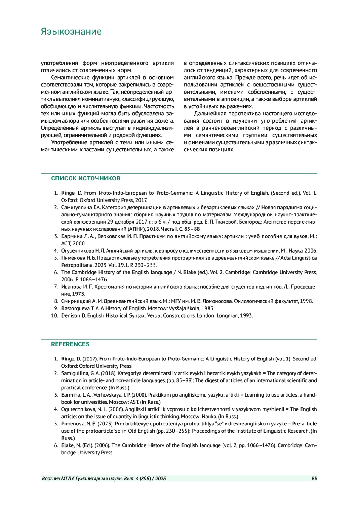 5. Пименова Н. Б. Предартиклевые употребления протоартикля se в древнеанглийском языке // Acta Linguistica Petropolitana. 2023. Vol. 19.1. P. 230-255. EDN: AWLNSV