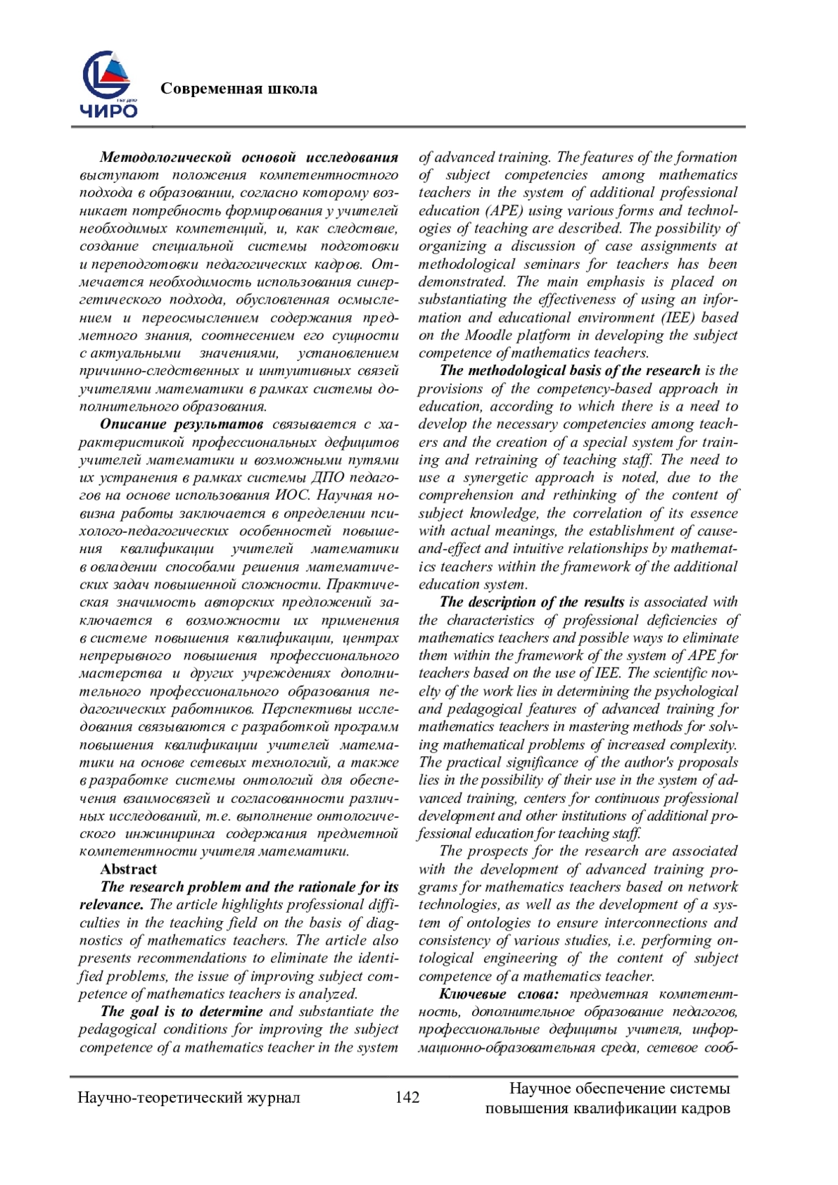 Проблема исследования и обоснование ее актуальности. В статье на основе диагностики учителей математики выделены их профессиональные затруднения в преподаваемой области, представлены рекомендации по устранению выявленных проблем, анализируется вопрос совершенствования предметной компетентности учителей математики. Ставится цель определения и обоснования педагогических условий совершенствования предметной компетентности учителя математики в системе повышения квалификации педагогов. Описаны особенности формирования предметных компетенций у учителей математики в системе дополнительного образования (ДПО) с использованием различных форм и технологий обучения. Продемонстрирована возможность организации обсуждения кейс-заданий на методических семинарах учителей. Основной акцент сделан на обоснование эффективности применения информационно-образовательной среды (ИОС) на базе платформы Moodle в развитии предметной компетентности учителей математики. Методологической основой исследования выступают положения компетентностного подхода в образовании, согласно которому возникает потребность формирования у учителей необходимых компетенций, и, как следствие, создание специальной системы подготовки и переподготовки педагогических кадров. Отмечается необходимость использования синергетического подхода, обусловленная осмыслением и переосмыслением содержания предметного знания, соотнесением его сущности с актуальными значениями, установлением причинно-следственных и интуитивных связей учителями математики в рамках системы дополнительного образования. Описание результатов связывается с характеристикой профессиональных дефицитов учителей математики и возможными путями их устранения в рамках системы ДПО педагогов на основе использования ИОС. Научная новизна работы заключается в определении психолого-педагогических особенностей повышения квалификации учителей математики в овладении способами решения математических задач повышенной сложности. Практическая значимость авторских предложений заключается в возможности их применения в системе повышения квалификации, центрах непрерывного повышения профессионального мастерства и других учреждениях дополнительного профессионального образования педагогических работников. Перспективы исследования связываются с разработкой программ повышения квалификации учителей математики на основе сетевых технологий, а также в разработке системы онтологий для обеспечения взаимосвязей и согласованности различных исследований, т. е. выполнение онтологического инжиниринга содержания предметной компетентности учителя математики.