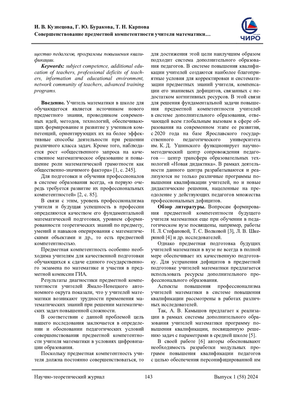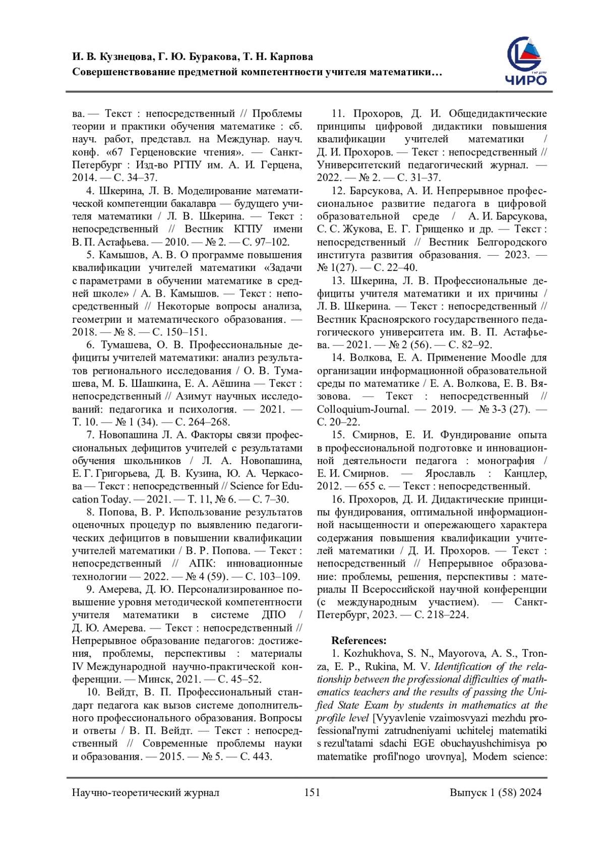 13. Шкерина, Л. В. Профессиональные дефициты учителя математики и их причины / Л. В. Шкерина. - Текст: непосредственный // Вестник Красноярского государственного педагогического университета им. В. П. Астафьева. - 2021. - № 2 (56). - С. 82-92. EDN: GYCMZN