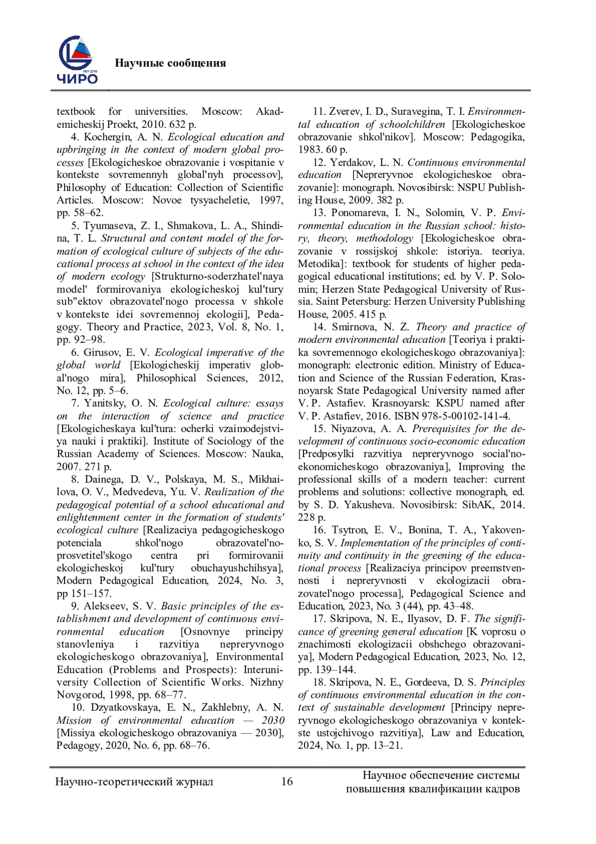 16. Цытрон, Е. В. Реализация принципов преемственности и непрерывности в экологизации образовательного процесса / Е. В. Цытрон, Т. А. Бонина, С. В. Яковенко. - Текст : непосредственный // Педагогическая наука и образование. - 2023. - № 3 (44). - С. 43-48.
