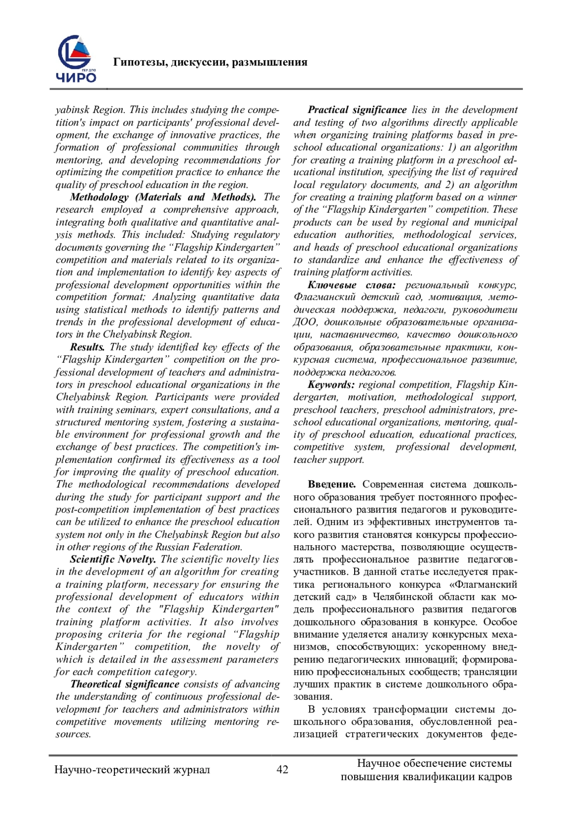 Проблема исследования и обоснование ее актуальности. Актуальность исследования обусловлена необходимостью изучения возможностей профессионального развития педагогов и руководителей в условиях конкурсного движения. В статье рассматривается практика регионального конкурса «Флагманский детский сад» в Челябинской области, который стимулирует инновационную активность, обмен лучшими практиками в формате наставничества и формирование профессиональных сообществ. Исследование раскрывает потенциал конкурса как инструмента мотивации и методической поддержки, анализирует его влияние на качество дошкольного образования. Особое внимание уделено выявленным эффектам: росту педагогической инициативы, внедрению перспективных образовательных технологий и созданию сети наставничества. Результаты могут быть использованы для совершенствования системы непрерывного профессионального развития педагогов в других регионах РФ. Цель исследования. Целью исследования является оценка возможностей профессионального развития педагогов и руководителей дошкольных образовательных организаций в рамках регионального конкурса «Флагманский детский сад» в Челябинской области. Это включает в себя изучение влияния конкурса на повышение квалификации участников, обмен инновационными практиками и формирование профессиональных сообществ в формате наставничества, а также разработку рекомендаций по оптимизации конкурсной практики для повышения качества дошкольного образования в регионе. Методология (материалы и методы). В рамках исследования использован комплексный подход, включающий как качественные, так и количественные методы анализа. Изучение нормативных актов, регламентирующих проведение конкурса «Флагманский детский сад», а также материалов, связанных с его организацией и проведением. Это позволит выявить ключевые аспекты возможностей профессионального развития в формате конкурса. Обработка собранных количественных данных с использованием статистических методов для выявления закономерностей и тенденций в профессиональном развитии педагогов Челябинской области. Результаты. Проведенное исследование позволило выявить ключевые эффекты влияния конкурса «Флагманский детский сад» на профессиональное развитие педагогов и руководителей дошкольных образовательных организаций Челябинской области. Для участников были организованы обучающие семинары, консультации экспертов, сформирована система наставничества, что позволило создать устойчивую среду для профессионального роста и обмена лучшими практиками. Реализация конкурса подтвердила его эффективность как инструмента повышения качества дошкольного образования. Разработанные в ходе исследования методические рекомендации по сопровождению участников и постконкурсному внедрению лучших практик могут быть использованы для совершенствования системы дошкольного образования не только в Челябинской области, но и в других регионах РФ. Научная новизна заключается в том, что разработан алгоритм создания стажировочной площадки, необходимый для обеспечения профессионального развития педагогов в контексте деятельности стажировочной площадки «Флагманский детский сад», предложены критерии регионального конкурса «Флагманский детский сад», новизна которых зак