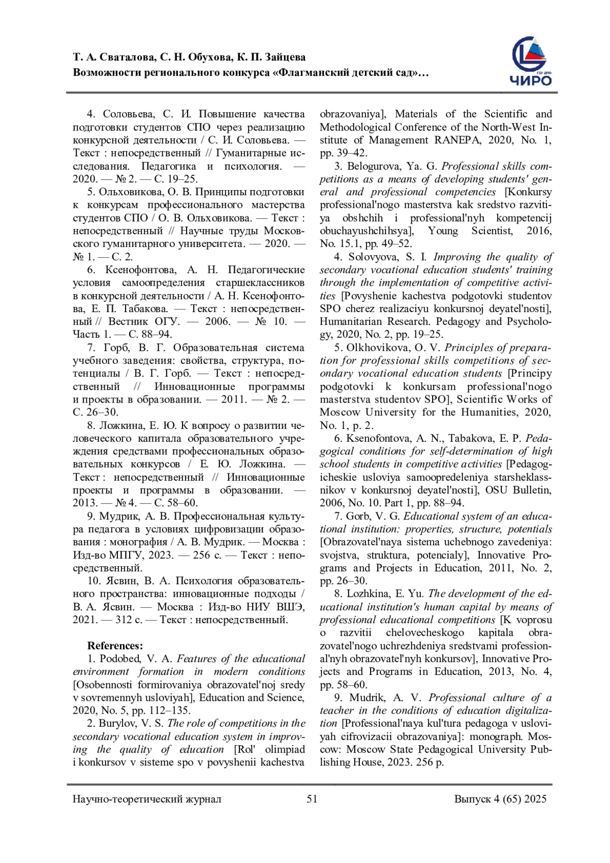 4. Соловьева, С. И. Повышение качества подготовки студентов СПО через реализацию конкурсной деятельности / С. И. Соловьева. - Текст : непосредственный // Гуманитарные исследования. Педагогика и психология. - 2020. - № 2. - С. 19-25.