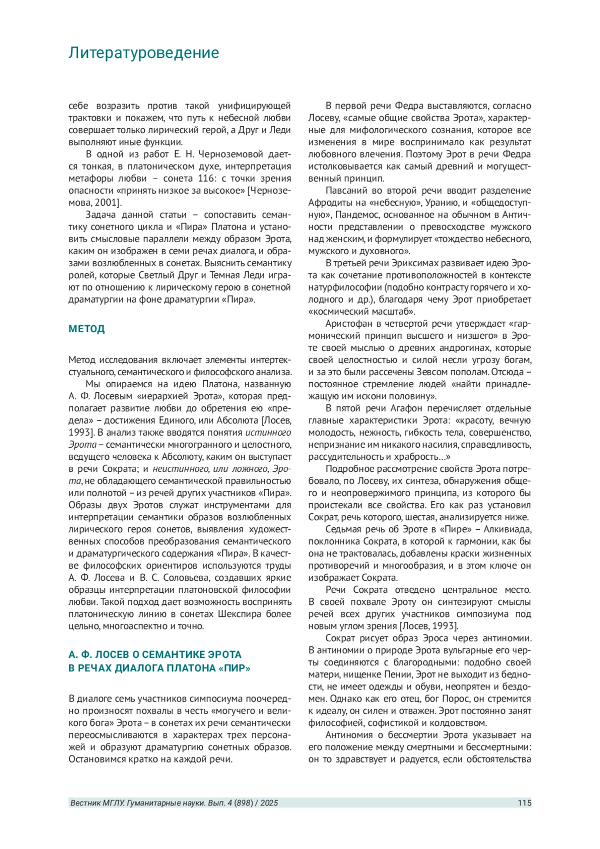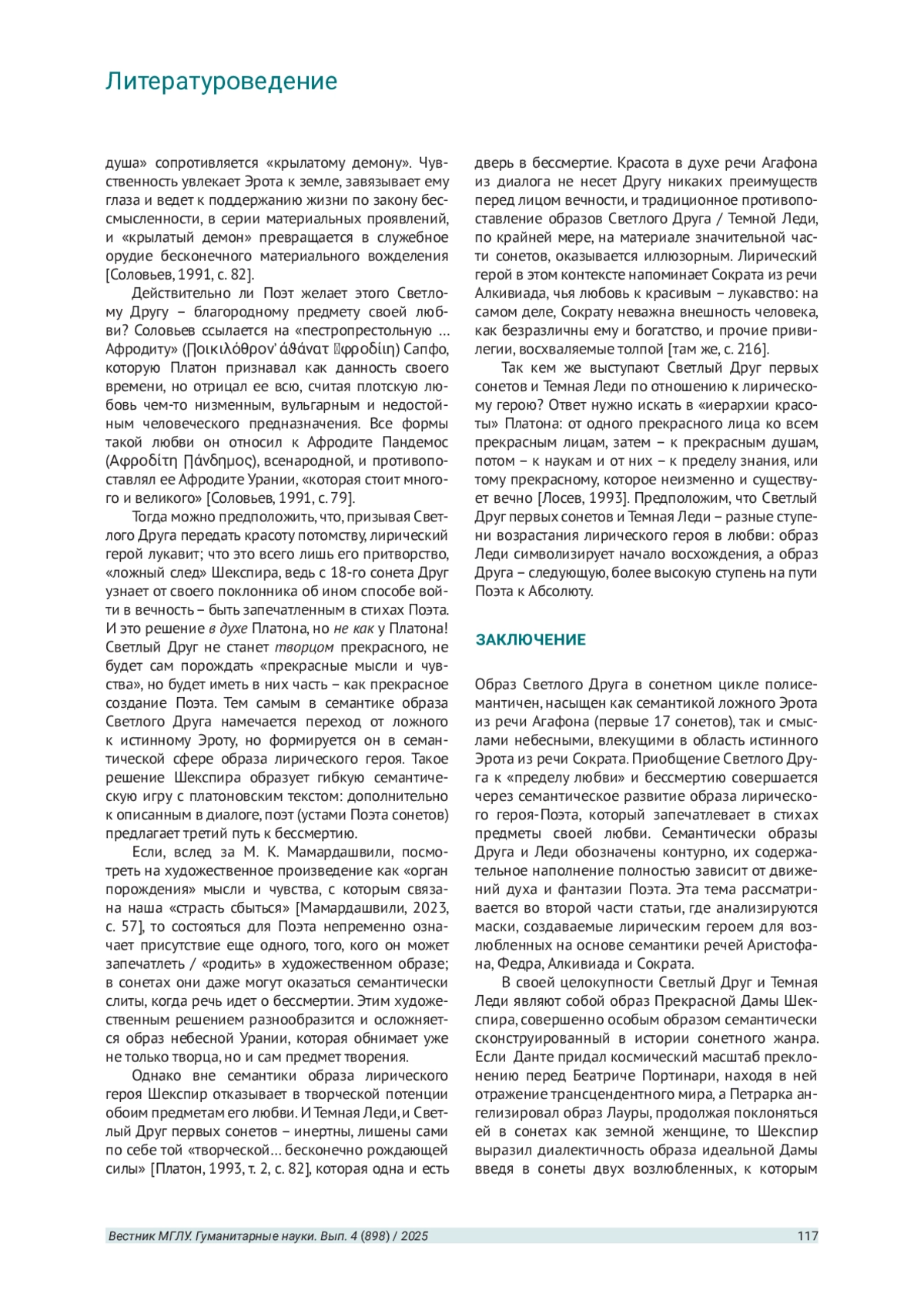Публикация - первая часть исследования, в котором сопоставляется семантика образов возлюбленных шекспировских сонетов и образа Эрота в диалоге Платона «Пир». Метафизический смысл образов Светлого Друга и Темной Леди исследователи обычно интерпретируют как антитезу двух Афродит из речи Павсания. Наша цель - показать, что поэт использует платоновские смыслы более сложно и разнообразно, наделяя сонетных персонажей свойствами Эрота, истинного и ложного, из всех речей диалога, что ведет к полисемантичности, коллажности образов героев, смене их масок из сонета в сонет. Обращение к трудам А. Ф. Лосева и В. С. Соловьева дает возможность расширить рецептивный контекст шекспировских персонажей, по новому интерпретировать их соотношение и функции в платонической перспективе.