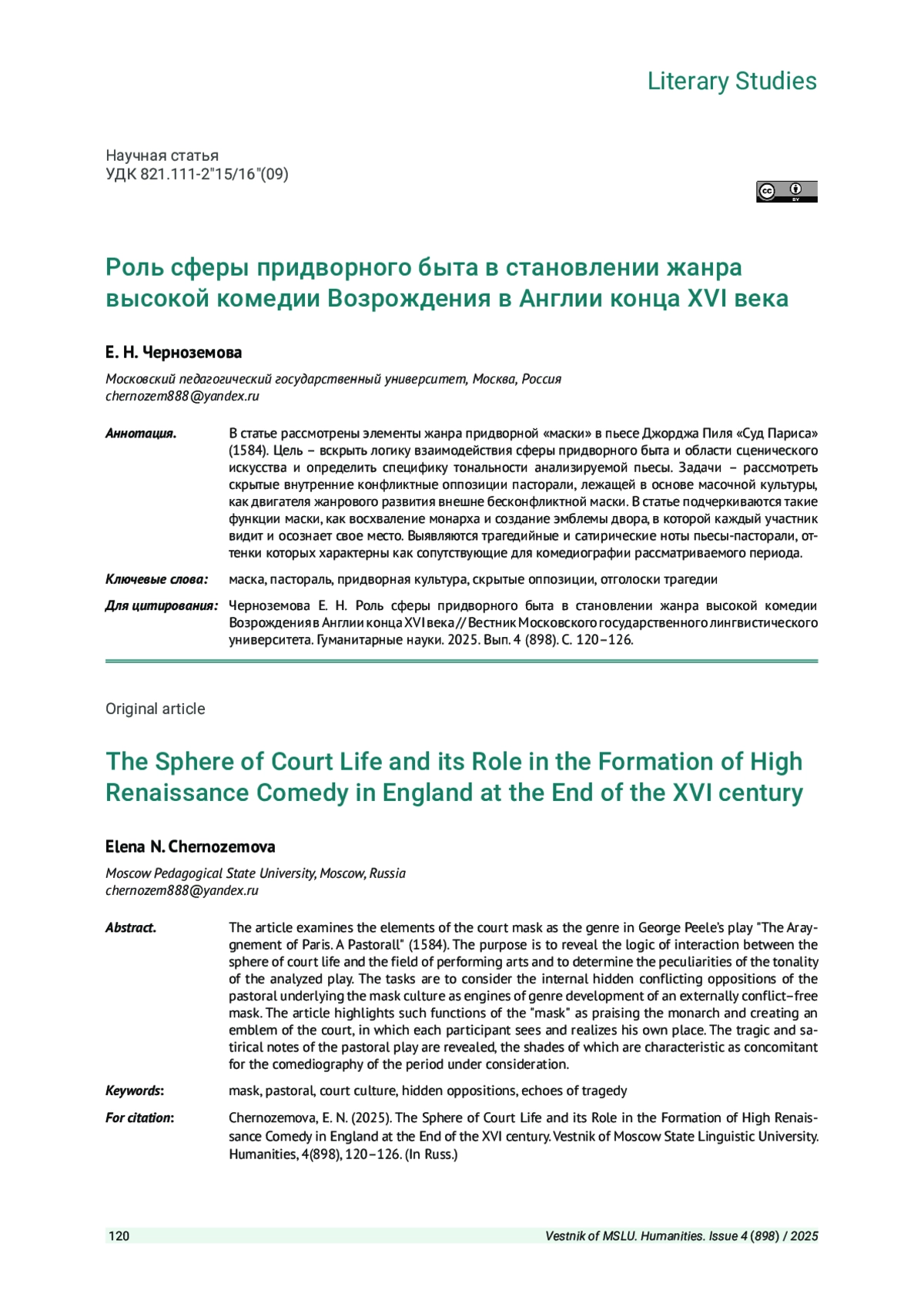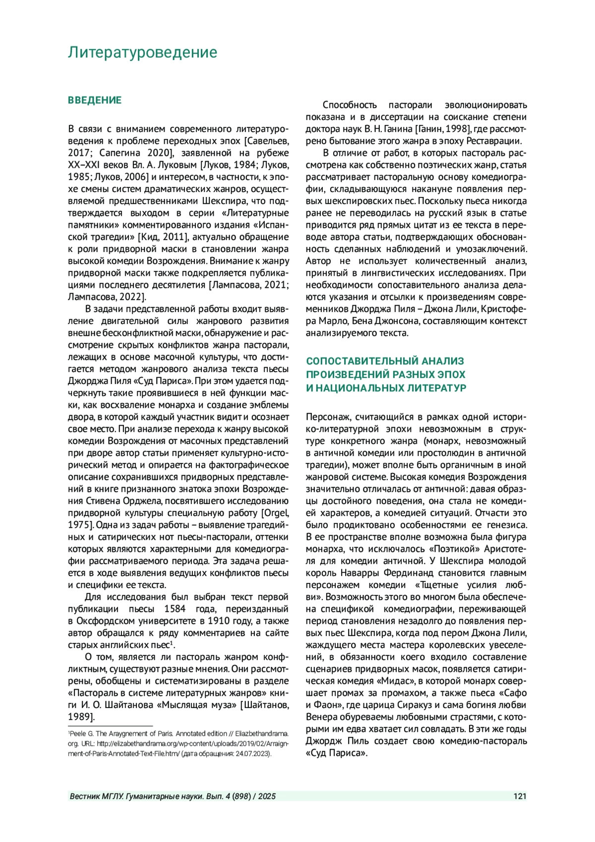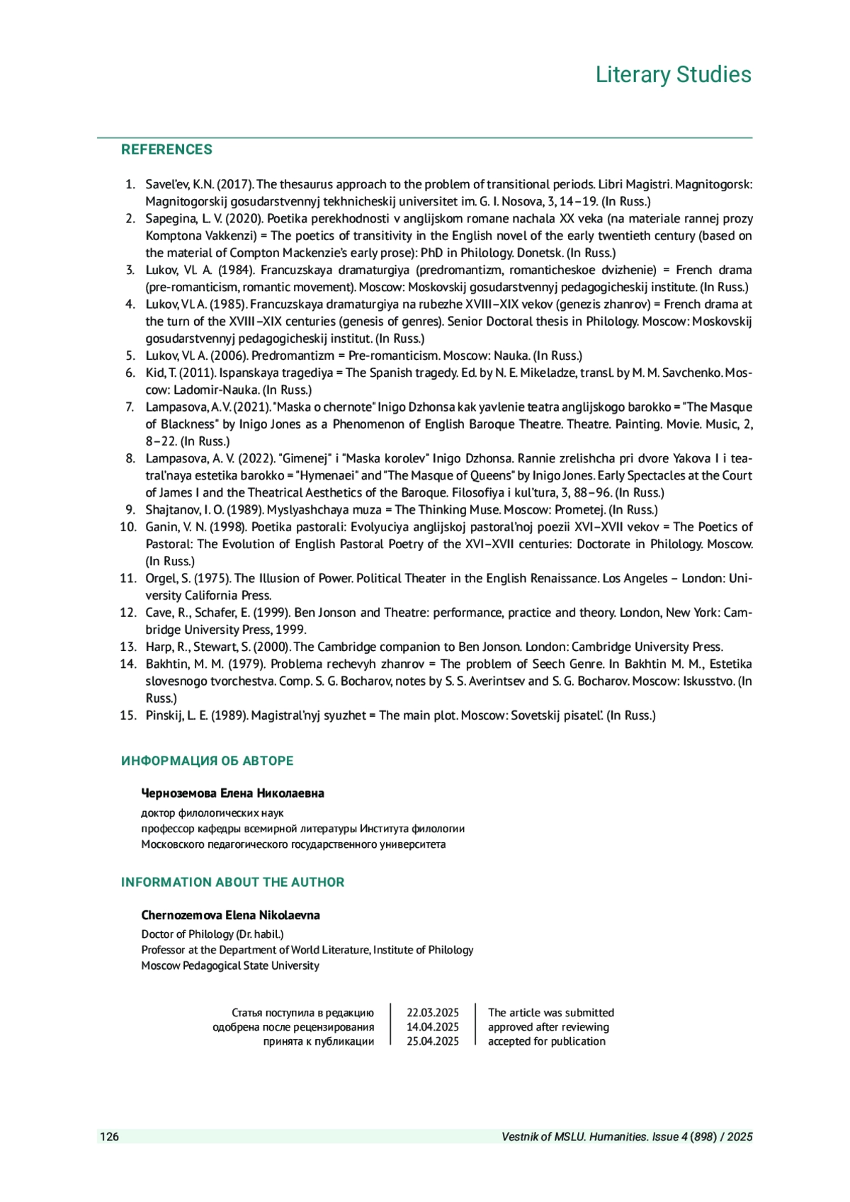 В связи с вниманием современного литературоведения к проблеме переходных эпох [Савельев, 2017; Сапегина 2020], заявленной на рубеже XX–XXI веков Вл. А. Луковым [Луков, 1984; Луков, 1985; Луков, 2006] и интересом, в частности, к эпохе смены систем драматических жанров, осуществляемой предшественниками Шекспира, что подтверждается выходом в серии «Литературные памятники» комментированного издания «Испанской трагедии» [Кид, 2011], актуально обращение к роли придворной маски в становлении жанра высокой комедии Возрождения. Внимание к жанру придворной маски также подкрепляется публикациями последнего десятилетия [Лампасова, 2021; Лампасова, 2022].