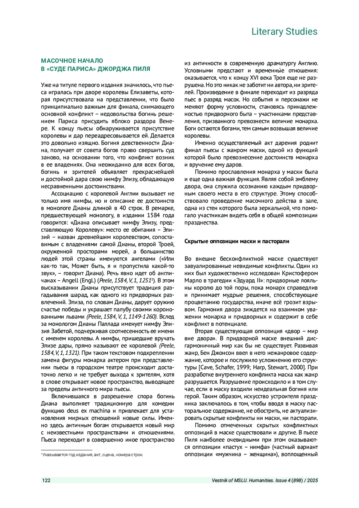 В статье рассмотрены элементы жанра придворной «маски» в пьесе Джорджа Пиля «Суд Париса» (١٥٨٤). Цель - вскрыть логику взаимодействия сферы придворного быта и области сценического искусства и определить специфику тональности анализируемой пьесы. Задачи - рассмотреть скрытые внутренние конфликтные оппозиции пасторали, лежащей в основе масочной культуры, как двигателя жанрового развития внешне бесконфликтной маски. В статье подчеркиваются такие функции маски, как восхваление монарха и создание эмблемы двора, в которой каждый участник видит и осознает свое место. Выявляются трагедийные и сатирические ноты пьесы-пасторали, оттенки которых характерны как сопутствующие для комедиографии рассматриваемого периода.