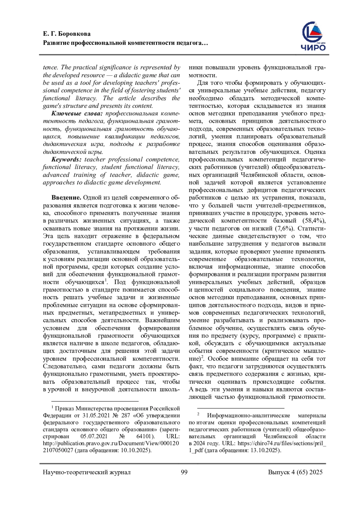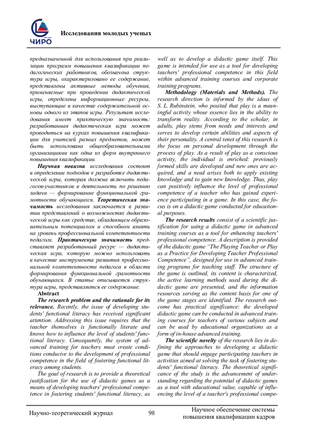 Проблема исследования и обоснование ее актуальности. В последнее время большое внимание уделяется проблеме формирования функциональной грамотности обучающихся. Для решения данной проблемы необходимо, чтобы педагог сам был функционально грамотным и знал, каким образом влиять на уровень функциональной грамотности обучающихся. Следовательно, в системе повышения квалификации педагогов должны быть созданы условия, способствующие развитию профессиональной компетентности в области формирования функциональной грамотности обучающихся. Цель исследования заключается в теоретическом обосновании и описании практики развития профессиональной компетентности педагога в области формирования функциональной грамотности обучающихся на основе применения метода дидактической игры. Методология (материалы и методы). Направление исследования определяется идеями С. Л. Рубинштейна о том, что игра является осмысленной деятельностью, ее суть заключается в способности преображать действительность. По мнению ученого, игра у взрослого исходит из потребностей и интересов и служит развитию определенных способностей и сторон его личности. Определяющей в исследовании является установка на развитие личности в процессе игры. В результате игры как осознанной деятельности личность обогащается: развиваются сформированные ранее навыки и приобретаются новые, возникает потребность в применении имеющихся знаний и получении новых. Таким образом, игра может положительно влиять на уровень профессиональной компетентности педагога, получившего опыт участия в игре. В данном случае речь идет о дидактической игре, которая проводится в учебных целях. Результаты исследования состоят в научном обосновании применения дидактической игры на курсах повышения квалификации как инструмента развития профессиональной компетентности педагогов. Представлено описание дидактической игры «Педагог играющий, или Игра как практика развития профессиональной компетентности педагога», предназначенной для использования при реализации программ повышения квалификации педагогических работников, обозначена структура игры, охарактеризовано ее содержание, представлены активные методы обучения, применяемые при проведении дидактической игры, определены информационные ресурсы, выступающие в качестве содержательной основы одного из этапов игры. Результат исследования имеет практическую значимость: разработанная дидактическая игра может проводиться на курсах повышения квалификации для учителей разных предметов, может быть использована общеобразовательными организациями как одна из форм внутреннего повышения квалификации. Научная новизна исследования состоит в определении подходов к разработке дидактической игры, которая должна включить педагогов-участников в деятельность по решению задачи - формирование функциональной грамотности обучающихся. Теоретическая значимость исследования заключается в развитии представлений о возможностях дидактической игры как средстве, обладающем образовательным потенциалом и способном влиять на уровень профессиональной компетентности педагога. Практическую значимость представляет разработанный ресурс - дидактическая игра, которую можно использовать в качестве инструмента развития профессиональной компет