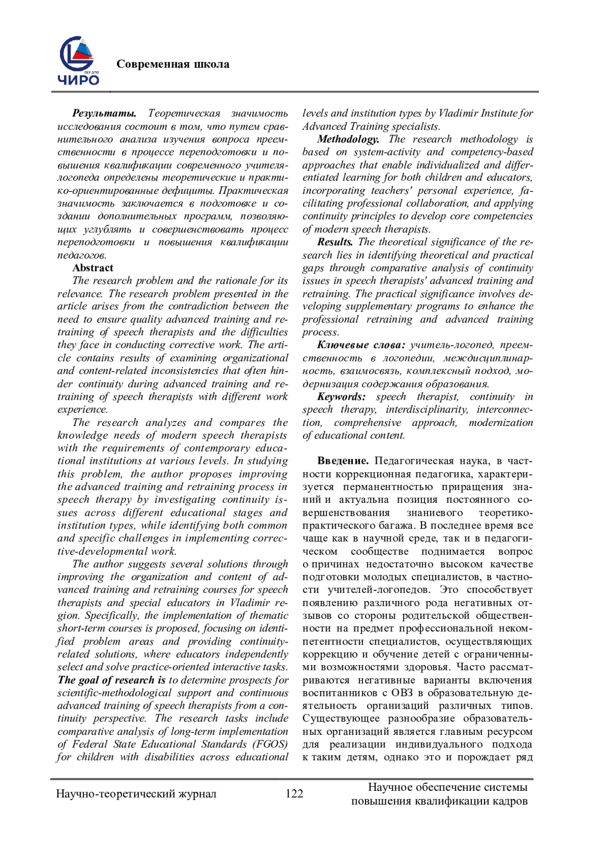 Проблема исследования и обоснование ее актуальности. Проблема, представленная в статье, обусловлена возникающим противоречием между необходимостью обеспечения качественного процесса повышения квалификации и переподготовки учителя-логопеда и возникающими трудностями в осуществлении коррекционной работы. Статья содержит результаты изучения возникающих организационных и содержательных несоответствий, которые часто являются проблемой в решении вопроса преемственности в период повышения квалификации и переподготовки учителей-логопедов с разным стажем работы. Анализируются и сравниваются знаниевые потребности современного учителя-логопеда и требования современных образовательных учреждений разных ступеней. В ходе изучения данной проблемы предлагается совершенствование процесса повышения квалификации и переподготовки в области логопедии на основе рассмотрения и исследования вопросов преемственности различных ступеней образования, различных типов образовательных организаций и выделения общих и специфических трудностей в реализации коррекционно-развивающей работы. Автором предлагаются некоторые пути решения данной проблемы посредством усовершенствования организации и содержания курсов повышения квалификации и переподготовки учителей-логопедов, дефектологов Владимирской области. Предлагается внедрение в практику обучения проведение тематических кратковременных курсов, направленных на рассмотрение выявленных проблемных вопросов и дающих ответ на эти вопросы по преемственности в работе. В процессе обучения на данных курсах педагог самостоятельно осуществляет выбор и находит решения практико-ориентированных, интерактивных заданий. Целью исследования является определение перспектив научно-методического сопровождения и обеспечения непрерывного повышения квалификации учителей-логопедов с позиции рассмотрения вопроса преемственности. Задачи исследования включают сравнительный анализ многолетней работы по реализации сотрудниками Владимирского института повышения квалификации ФГОС для детей с ОВЗ различных ступеней и типов образования. Методология исследования опирается на системно-деятельностный и компетентностный подходы, позволяющие осуществлять индивидуализацию и дифференциацию обучения как детей, так и педагогов, опираясь на личный опыт педагога, вовлекая его в комфортное взаимодействие с коллегами и основываясь на принципах осуществления преемственных связей обучения, формируя основные компетенции современного учителя-логопеда. Результаты. Теоретическая значимость исследования состоит в том, что путем сравнительного анализа изучения вопроса преемственности в процессе переподготовки и повышения квалификации современного учителя-логопеда определены теоретические и практико-ориентированные дефициты. Практическая значимость заключается в подготовке и создании дополнительных программ, позволяющих углублять и совершенствовать процесс переподготовки и повышения квалификации педагогов.