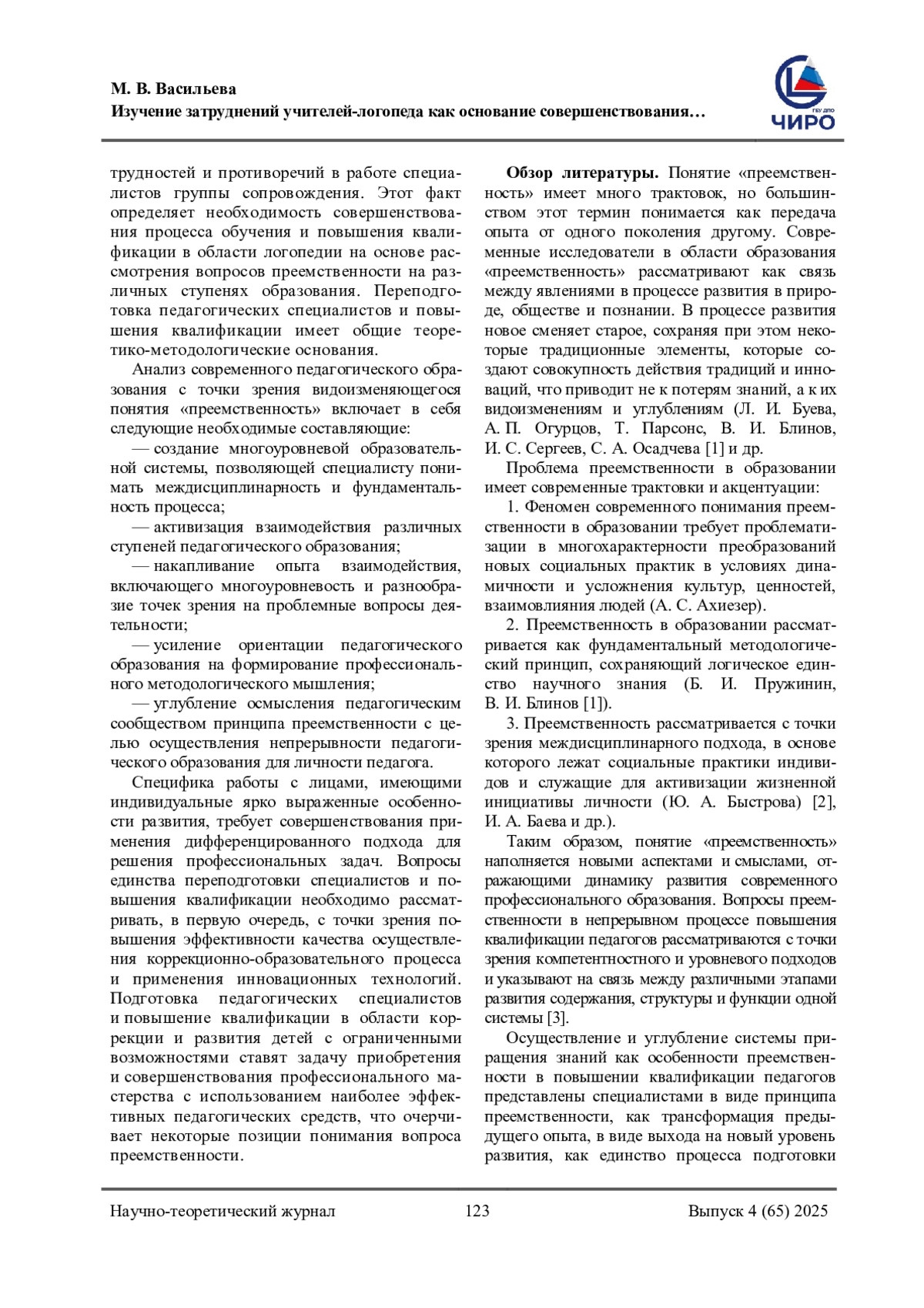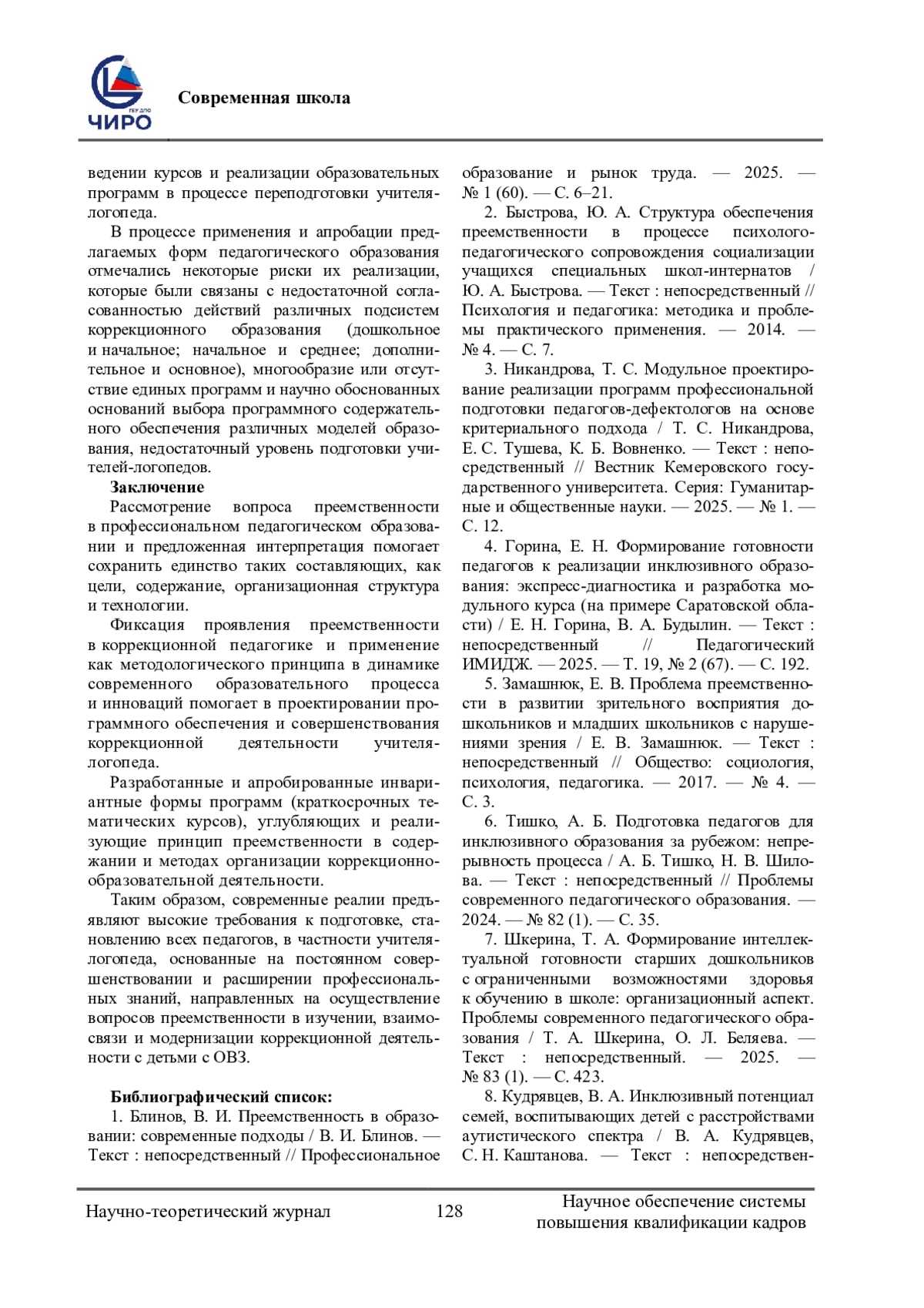 1. Блинов, В. И. Преемственность в образовании: современные подходы / В. И. Блинов. - Текст : непосредственный // Профессиональное образование и рынок труда. - 2025. - № 1 (60). - С. 6-21.