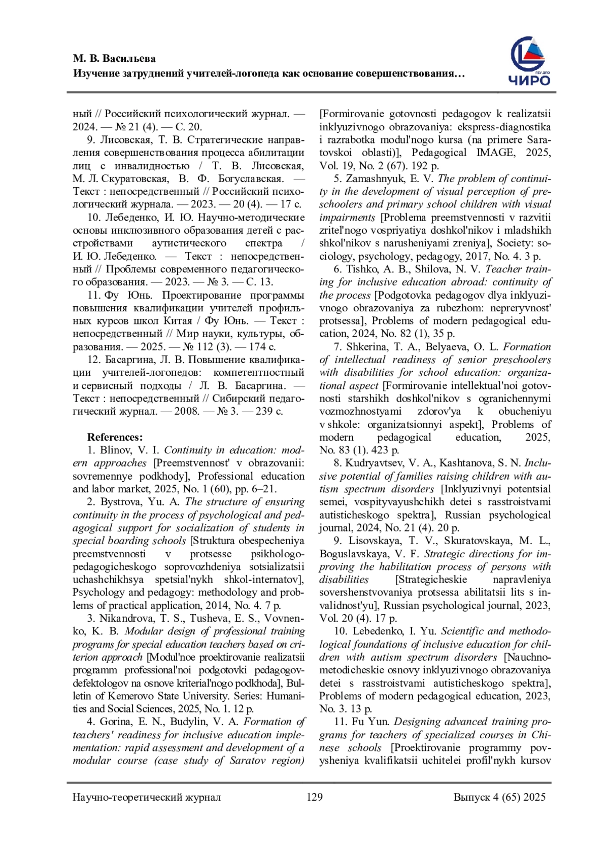 4. Горина, Е. Н. Формирование готовности педагогов к реализации инклюзивного образования: экспресс-диагностика и разработка модульного курса (на примере Саратовской области) / Е. Н. Горина, В. А. Будылин. - Текст : непосредственный // Педагогический ИМИДЖ. - 2025. - Т. 19, № 2 (67). - С. 192.
