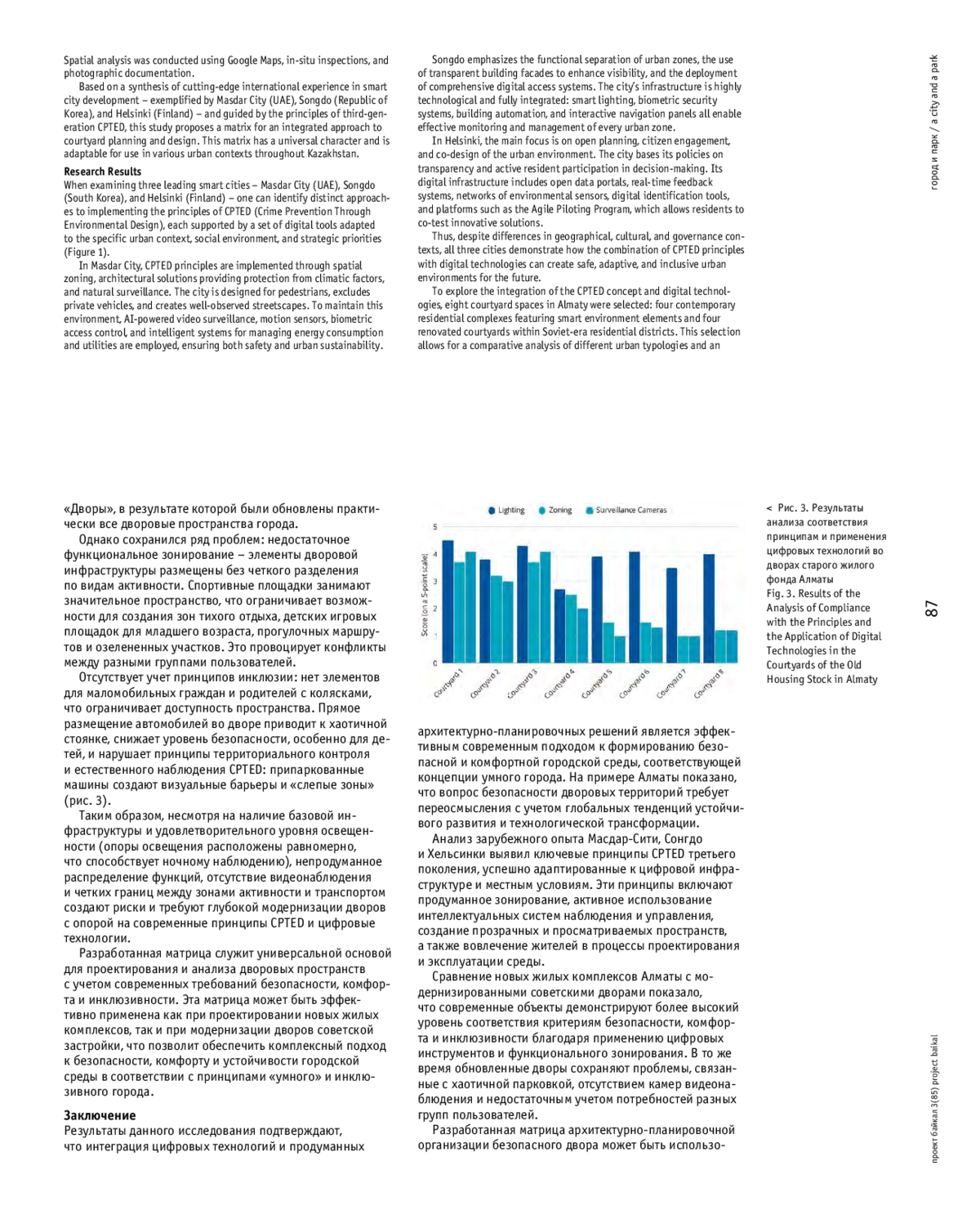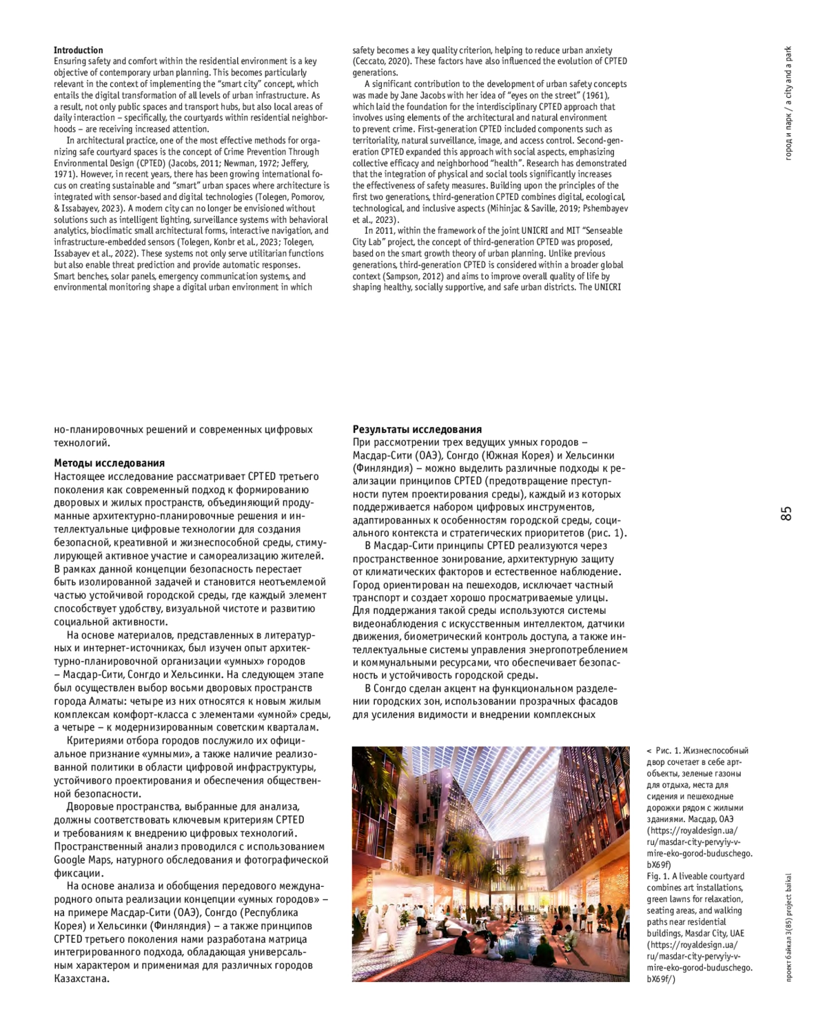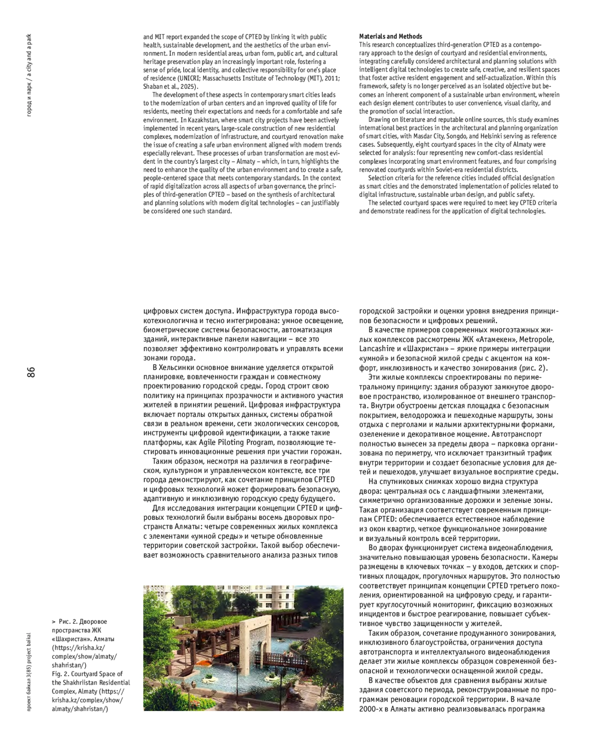 Настоящее исследование направлено на выявление и обоснование взаимосвязи цифровых технологий и архитектурно-планировочных решений как интегрированного подхода, соответствующего требованиям современных умных городов. В условиях активной трансформации пространственной среды города Алма-Аты (Алматы) особенно актуален поиск эффективных методов организации безопасных дворовых пространств. В результате проведенного сравнительного анализа и изучения опыта про ектирования безопасных дворовых территорий в современных умных городах разработана матрица интегрированного подхода организации безопасного двора, сочетающая принципы CPTED третьего поколения.