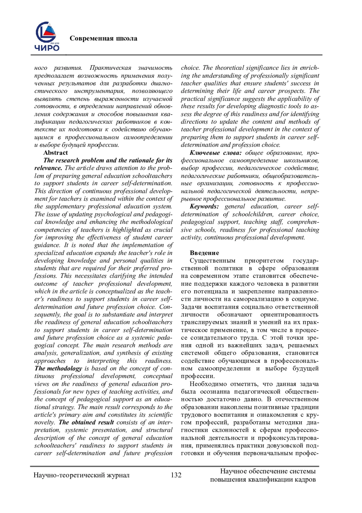 Проблема исследования и обоснование ее актуальности. В статье обращается внимание на проблему подготовки педагогических работников общеобразовательных организаций к содействию обучающимся в профессиональном самоопределении. Данное направление непрерывного профессионального развития педагогических работников рассматривается в контексте развития системы дополнительного профессионального образования. Актуализируется проблема обновления психолого-педагогических знаний и совершенствования методических компетенций педагогических работников, способствующих повышению эффективности профессиональной ориентации школьников. Отмечается, что в условиях внедрения профильного образования расширяются функции педагога в развитии знаний и личностных качеств обучающихся, востребованных в предпочитаемой обучающимися профессии. Это требует уточнения представлений о целевом результате повышения квалификации педагога, рассматриваемого в статье как готовность педагога к содействию обучающимся в профессиональном самоопределении и выборе будущей профессии. В связи с этим ставится цель обосновать и проинтерпретировать готовность педагогических работников общеобразовательных организаций к содействию обучающимся в профессиональном самоопределении и выборе будущей профессии как системное педагогическое понятие. Основными методами исследования являются: анализ, обобщение и синтез существующих подходов к интерпретации представлений об изучаемой готовности. В основу методологии настоящей статьи положена концепция непрерывного профессионального развития. Концептуальные представления о готовности специалистов системы общего образования к новым видам профессиональной педагогической деятельности. Представления о педагогическом содействии как образовательной стратегии. Представление основного результата отвечает основной цели статьи и определяет ее научную новизну. Полученный результат состоит в интерпретации, системном представлении и структурном описании понятия готовности педагогических работников общеобразовательных организаций к содействию обучающимся в профессиональном самоопределении и выборе будущей профессии. Теоретическая значимость связывается с обогащением представлений о профессионально значимых качествах педагога, обеспечивающих достижение обучающимися успешности в определении перспектив жизненного и профессионального развития. Практическая значимость предполагает возможность применения полученных результатов для разработки диагностического инструментария, позволяющего выявлять степень выраженности изучаемой готовности, в определении направлений обновления содержания и способов повышения квалификации педагогических работников в контексте их подготовки к содействию обучающимся в профессиональном самоопределении и выборе будущей профессии.