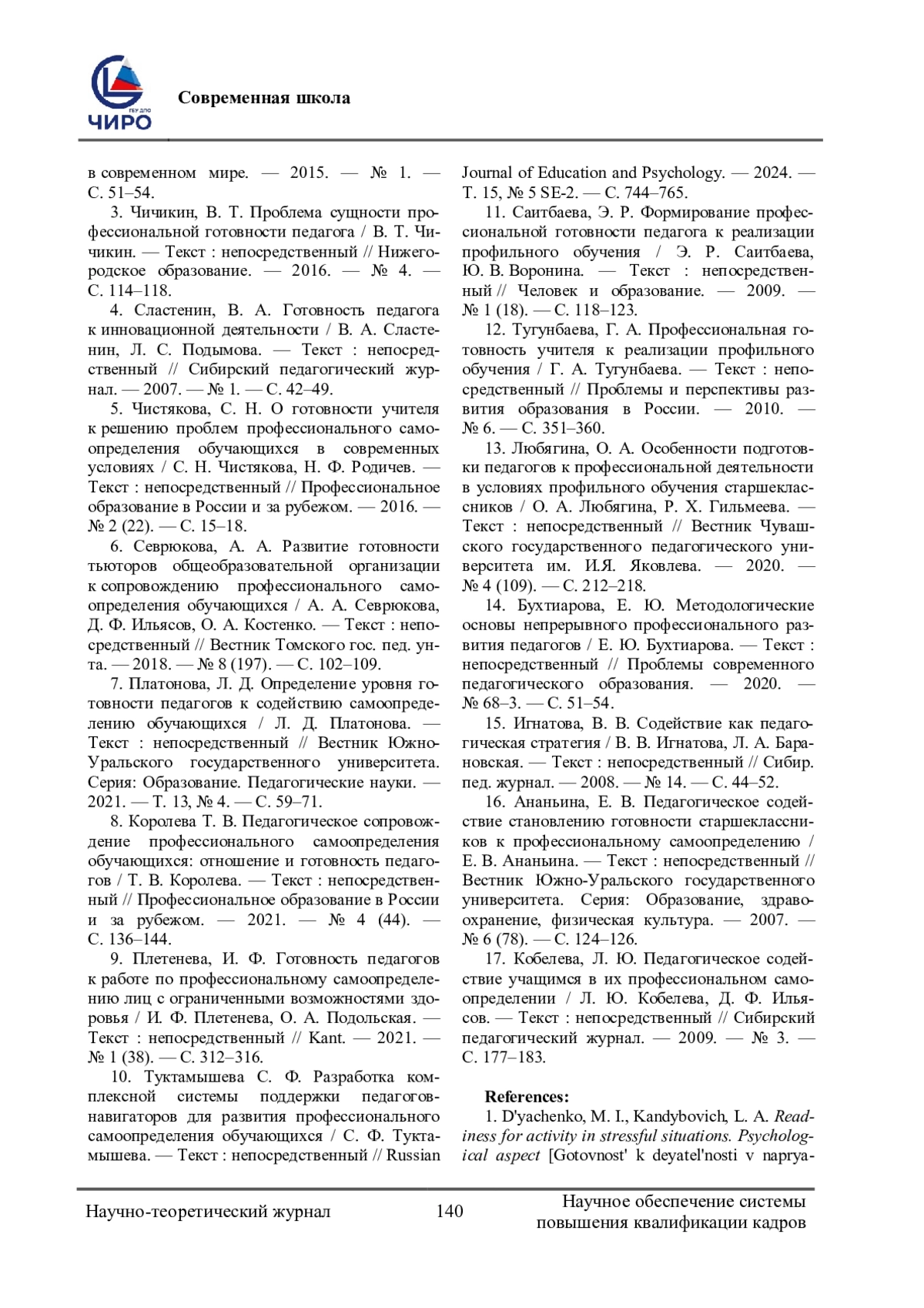 Проблема исследования и обоснование ее актуальности. Проблема исследования заключается в необходимости обновления содержания дополнительного профессионального образования для подготовки педагогических и руководящих работников школ к эффективной реализации профильного образования в соответствии с региональными стратегическими ориентирами (на примере стратегии «ТЕМП 74» в Челябинской области). Системе дополнительного профессионального образования педагогических работников необходимо реализовывать динамичные изменения в сфере общего образования. Выявлено противоречие между требованием к реализации эффективного профильного обучения в школах и недостаточным уровнем готовности педагогов к этой деятельности, что обусловлено не в полной мере отвечающим современным вызовам содержанием программ повышения квалификации. Необходимо формировать у педагогов практические компетенции для проектирования и реализации индивидуальных образовательных траекторий в условиях профилизации. Цель исследования состоит в разработке и представление дополнительной профессиональной программы повышения квалификации, направленной на совершенствование профессиональных компетенций школьных команд в сфере организации профильного обучения, профориентации и профессионального обучения. Методологической основой работы стала разработка модульной программы повышения квалификации, сочетающей инвариантные (нормативно-правовые, психолого-педагогические, организационные основы) и вариативные модули (для руководителей и педагогов). Методы реализации включают лекции, практические занятия, стажировки, проектирование и использование активных методов обучения с опорой на региональный опыт. В основу исследования положен деятельностный, проектный и ресурсный подходы. Использован комплекс теоретических методов: анализ психолого-педагогической и научно-методической литературы по проблеме профильного обучения и дополнительного профессионального образования, изучение педагогического опыта, моделирование. В результате создана комплексная программа, структура и содержание которой обеспечивают формирование у слушателей компетенций, необходимых для реализации профильного образования. Программа интегрирует региональный компонент («ТЕМП 74»), знакомит с современными инструментами (цифровые платформы, профориентационные онлайн-ресурсы) и носит практико-ориентированный характер. Заключение: разработанная программа повышения квалификации имеет свой значительный потенциал для подготовки педагогов в области профильного образования. Ключевой задачей на перспективу признано повышение мотивации и вовлеченности самих педагогических и руководящих работников к реализации данной образовательной стратегии. Содержание программы основано на принципах практико-ориентированности, индивидуализации и системности, что является ключевым условием эффективной подготовки педагогических коллективов к реализации профильного образования. Формирует у педагогов не только понимание сути профилизации, но и конкретные умения (технологии, методы, средства) для ее реализации, что в конечном итоге повышает качество образовательных результатов школьников.