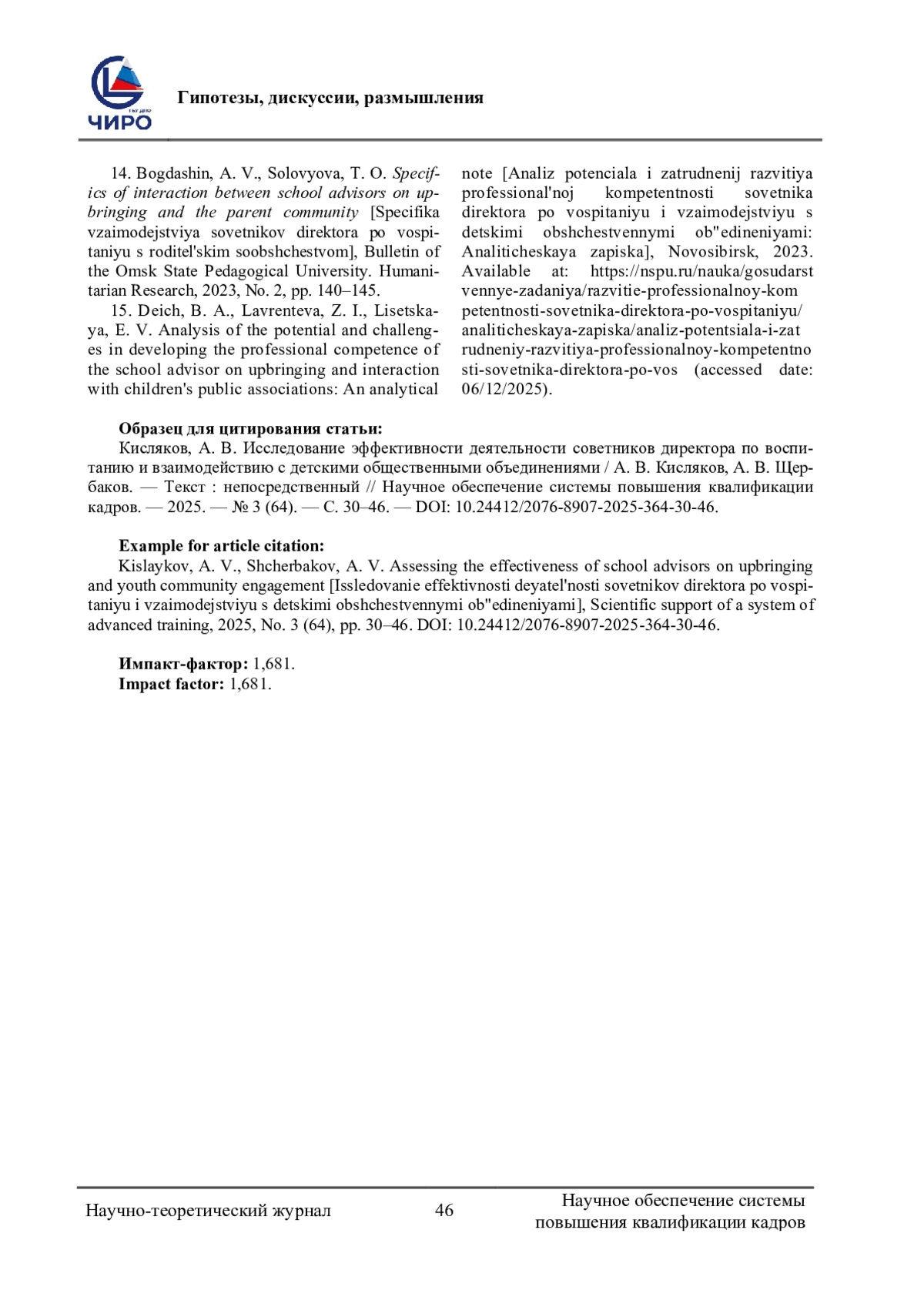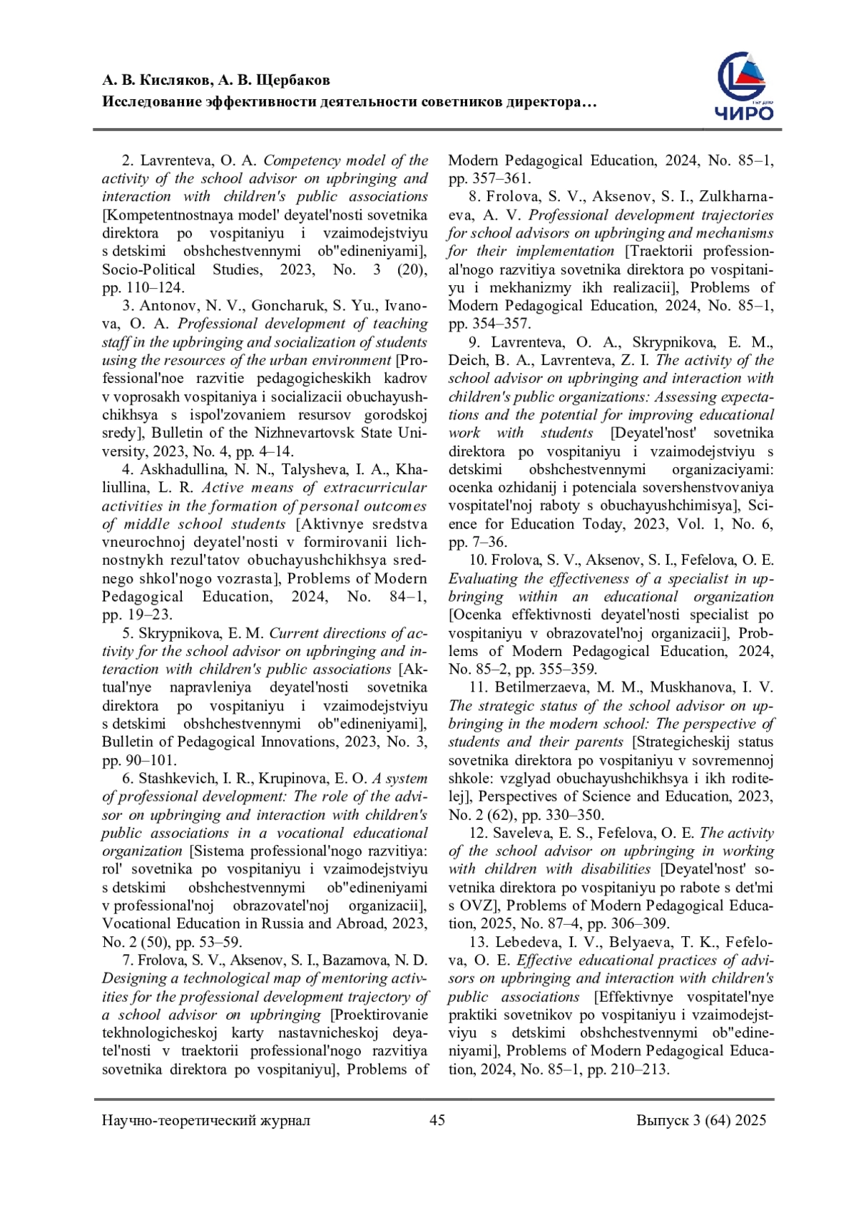 9. Лаврентьева, О. А. Деятельность советника директора по воспитанию и взаимодействию с детскими общественными организациями: оценка ожиданий и потенциала совершенствования воспитательной работы с обучающимися / О. А. Лаврентьева, Е. М. Скрыпникова, Б. А. Дейч, З. И. Лаврентьева. - Текст: непосредственный // Science for Education Today. - 2023. - Т. 1, № 6. - С. 7-36. EDN: MIOVXH