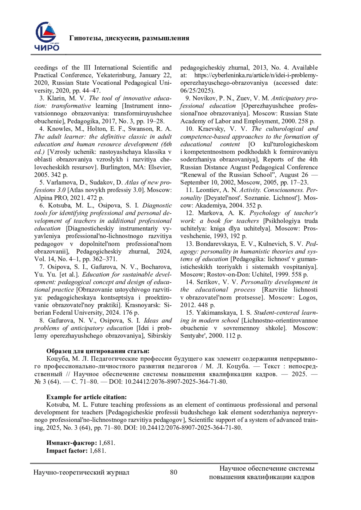 6. Коцуба, М. Л. Диагностический инструментарий выявления профессионально-личностного развития педагогов в дополнительном профессиональном образовании / М. Л. Коцуба, С. И. Осипова. - Текст: непосредственный // Педагогический журнал. - 2024. - Т. 14, № 4-1. - С. 362-371. EDN: OKURUG