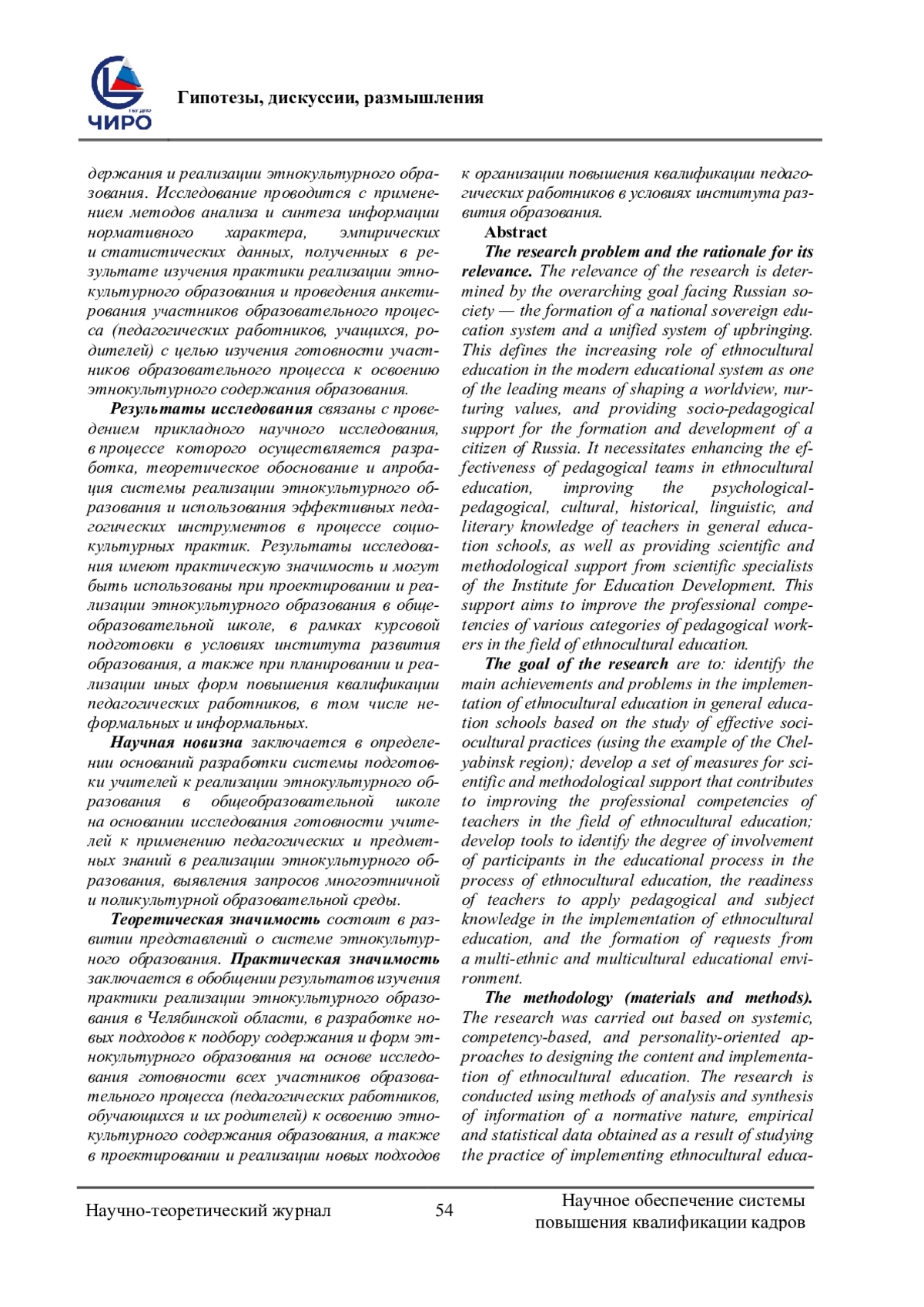 Проблема исследования и обоснование ее актуальности. Актуальность исследования определяется генеральной целью, стоящей перед российским обществом, - формирование национальной суверенной системы образования, единой системы воспитания, что определяет возрастающую роль этнокультурного образования в современной образовательной системе как одного из ведущих средств формирования мировоззрения, воспитания и социально-педагогической поддержки становления и развития гражданина России и делает необходимым повышение результативности работы педагогических коллективов по этнокультурному образованию, совершенствование психолого-педагогических, культурологических, исторических, лингвистических, литературоведческих знаний учителей общеобразовательных школ, а также научно-методическое сопровождение со стороны научных специалистов института развития образования, направленное на совершенствование профессиональных компетенций различных категорий педагогических работников в сфере этнокультурного образования. Цель исследования - выявить основные достижения и проблемы в реализации задач этнокультурного образования в общеобразовательной школе на основе изучения эффективных социокультурных практик (на примере Челябинской области), разработать комплекс мер научно-методического сопровождения, способствующего повышению профессиональных компетенций педагогических работников в сфере этнокультурного образования, разработать инструментарий, позволяющий выявить степень вовлеченности участников образовательного процесса в процесс этнокультурного образования, готовности учителей к применению педагогических и предметных знаний в реализации этнокультурного образования, сформированность запросов многоэтничной и поликультурной образовательной среды. Методология (материалы и методы). Исследование осуществлялось на основе системного, компетентностного, личностно ориентированного подходов к проектированию содержания и реализации этнокультурного образования. Исследование проводится с применением методов анализа и синтеза информации нормативного характера, эмпирических и статистических данных, полученных в результате изучения практики реализации этнокультурного образования и проведения анкетирования участников образовательного процесса (педагогических работников, учащихся, родителей) с целью изучения готовности участников образовательного процесса к освоению этнокультурного содержания образования. Результаты исследования связаны с проведением прикладного научного исследования, в процессе которого осуществляется разработка, теоретическое обоснование и апробация системы реализации этнокультурного образования и использования эффективных педагогических инструментов в процессе социокультурных практик. Результаты исследования имеют практическую значимость и могут быть использованы при проектировании и реализации этнокультурного образования в общеобразовательной школе, в рамках курсовой подготовки в условиях института развития образования, а также при планировании и реализации иных форм повышения квалификации педагогических работников, в том числе неформальных и информальных. Научная новизна заключается в определении оснований разработки системы подготовки учителей к реализаци
