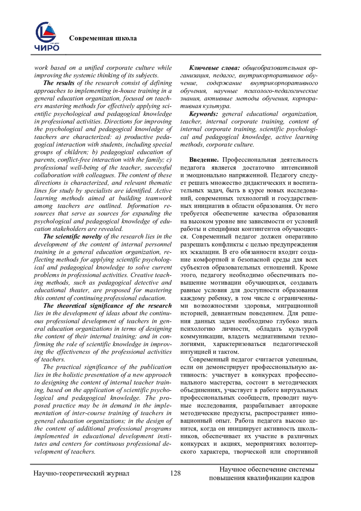 Ключевые фразы: общеобразовательная организация, ПЕДАГОГ, внутрикорпоративное обучение, содержание внутрикорпоративного обучения, научные психолого-педагогические знания, АКТИВНЫЕ МЕТОДЫ ОБУЧЕНИЯ, корпоративная культура